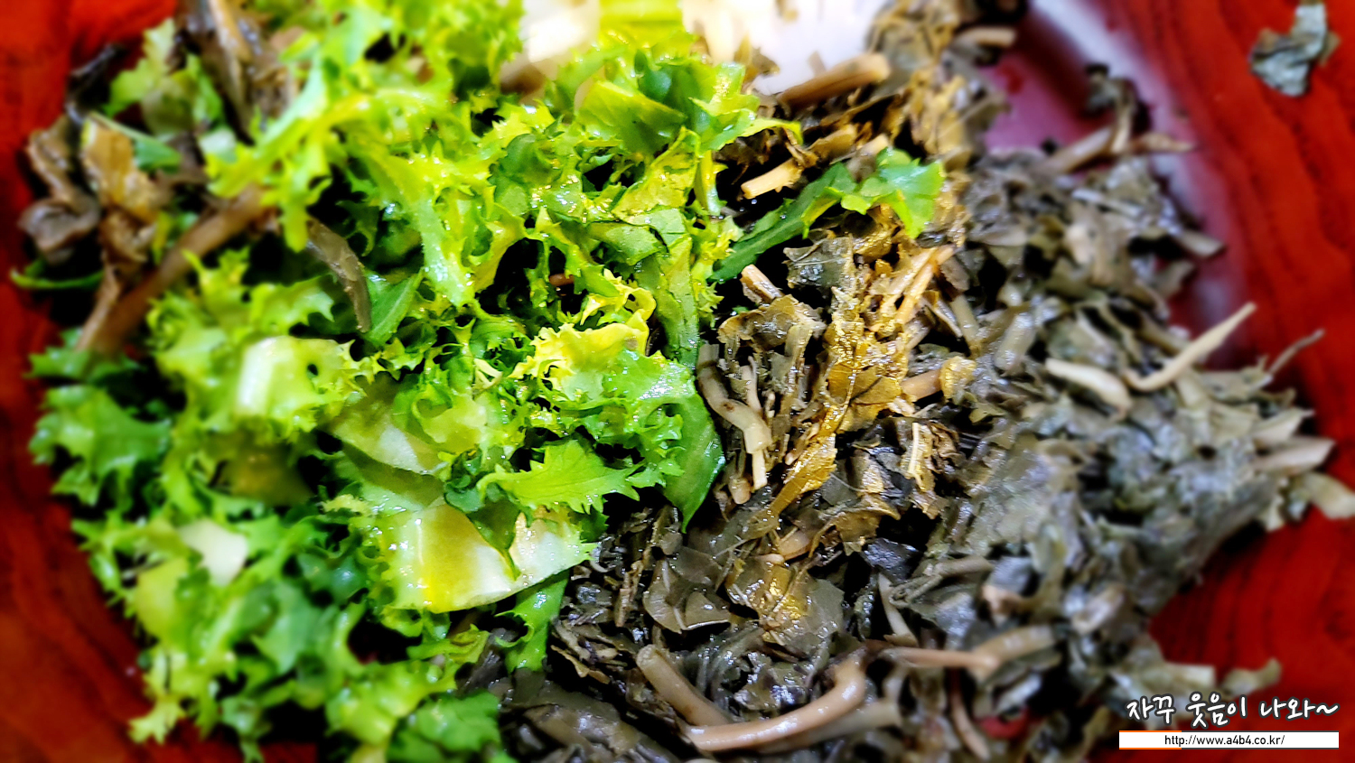 주문한 비빔밥이 나왔습니다. 무나물과 치커리... 그리고 나물 한 종류..