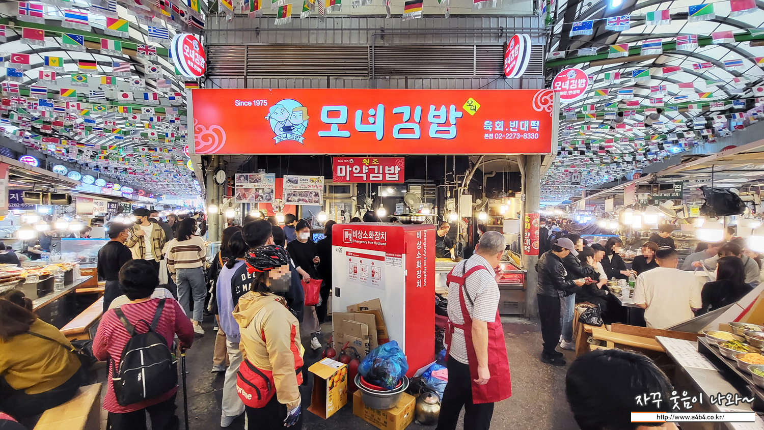 오늘의 1차 목적지인 광장시장 모녀김밥에 도착 했습니다. 광장시장 중앙에 위치한 2층건물입니다. 다른 상점과는 상당히 독특한...