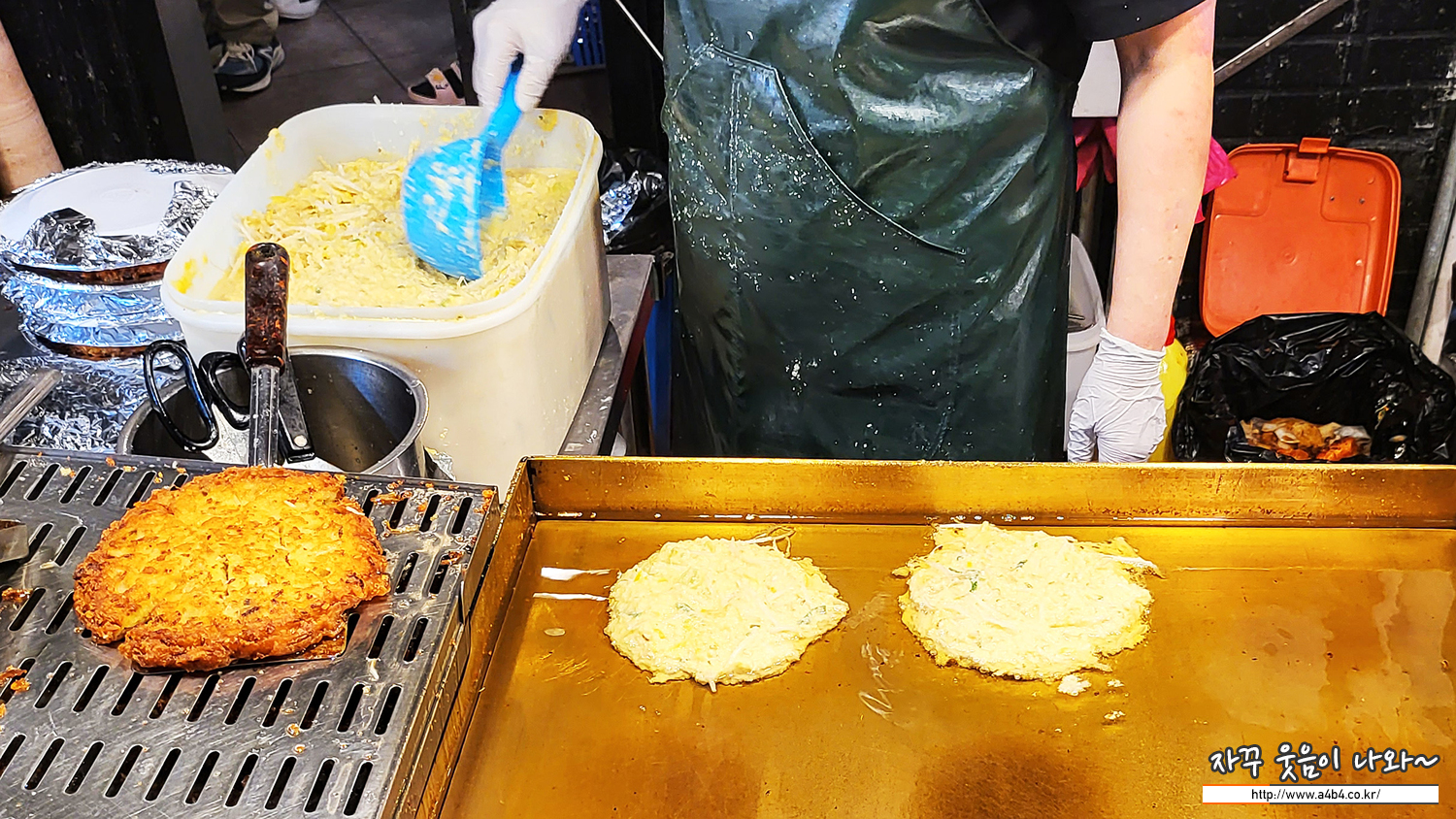 광장시장에서 많이 볼 수 있고 이곳 광장시장 맛집 모녀김밥 대표 메뉴 중 하나인 녹두빈대떡입니다.