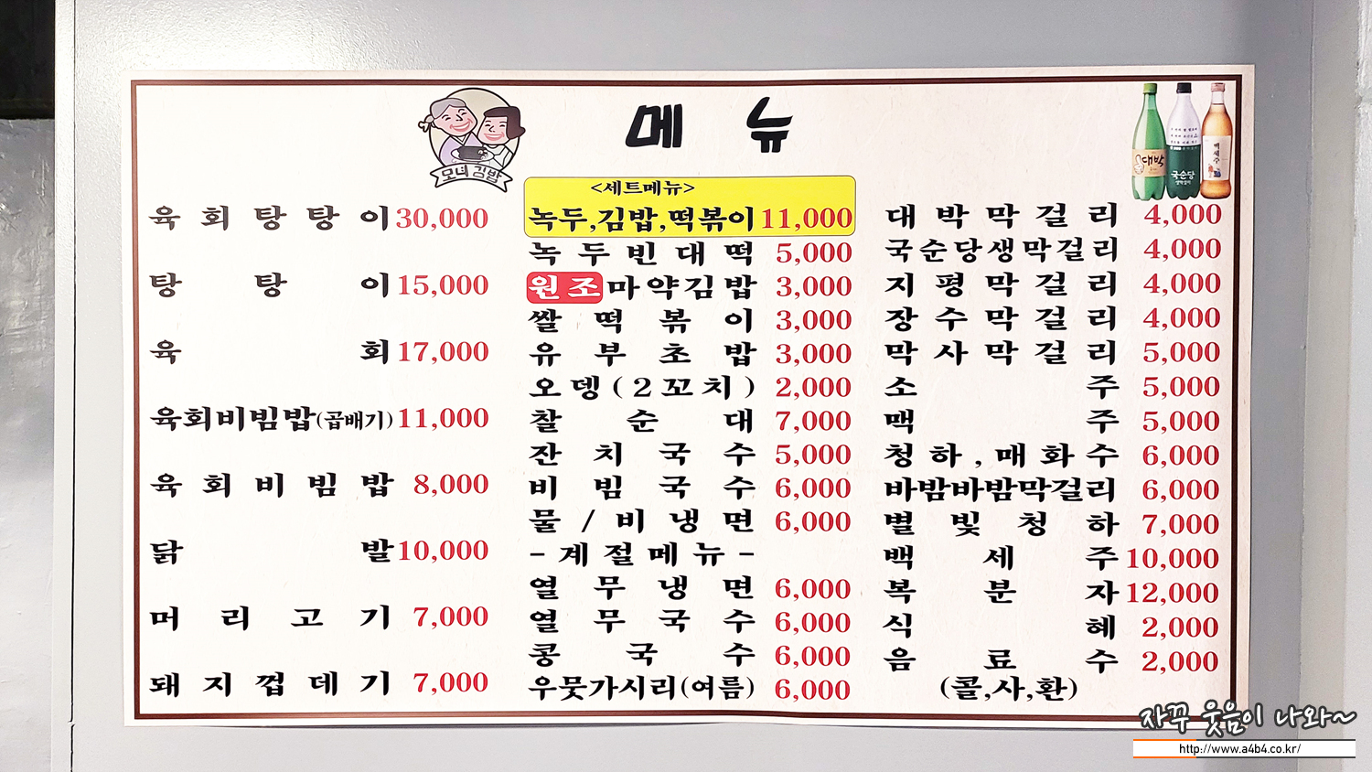 광장시장 맛집 모녀김밥 메뉴 및 가격입니다. 광장시장의 모든 맛집에 있는 육회와 탕탕이 육회요리는 역시나 있고요. 메뉴의 1/3을 차지하는 주류...