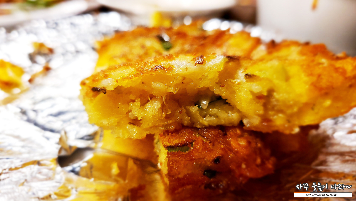 앞에서 소개드린 것과 같이 기름에 튀기다시피 조리한 빈대떡입니다. 여기에 양파가 들어간 양념장과 함께 먹는데요. 저는 양념장 없이도 충분히 간이 되어있다는 생각입니다. 두툼한 녹두전과 바삭바삭한 식감이 인상적인...