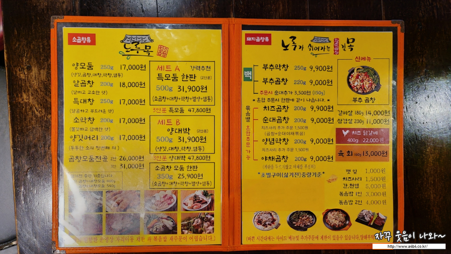 홍대 맛집 노루목 메인 메뉴는 소곱창과 돼지곱창으로 구성되어 있습니다. 소곱창은 양모듬, 양곱창, 특대창 단품과 소곱창 모듬 메뉴가 준비되어 있습니다.