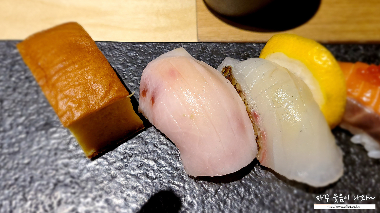 위 사진 맨 왼쪽은 카스테라 조각입니다. 먹기전에 카스테라다 달갈이다 의견이 분분했지만, 초밥에 카스테라 조합입니다.