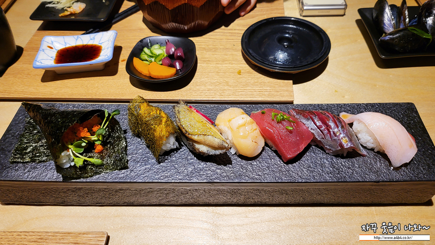 성게알, 전본, 관자, 참치, 고등어? 초밥들이 나왔네요. 12 조각이 한 번에 나왔다면 좀 더 즐겁고 맛있게 초밥을 먹을 수 있지 않았을까 합니다.