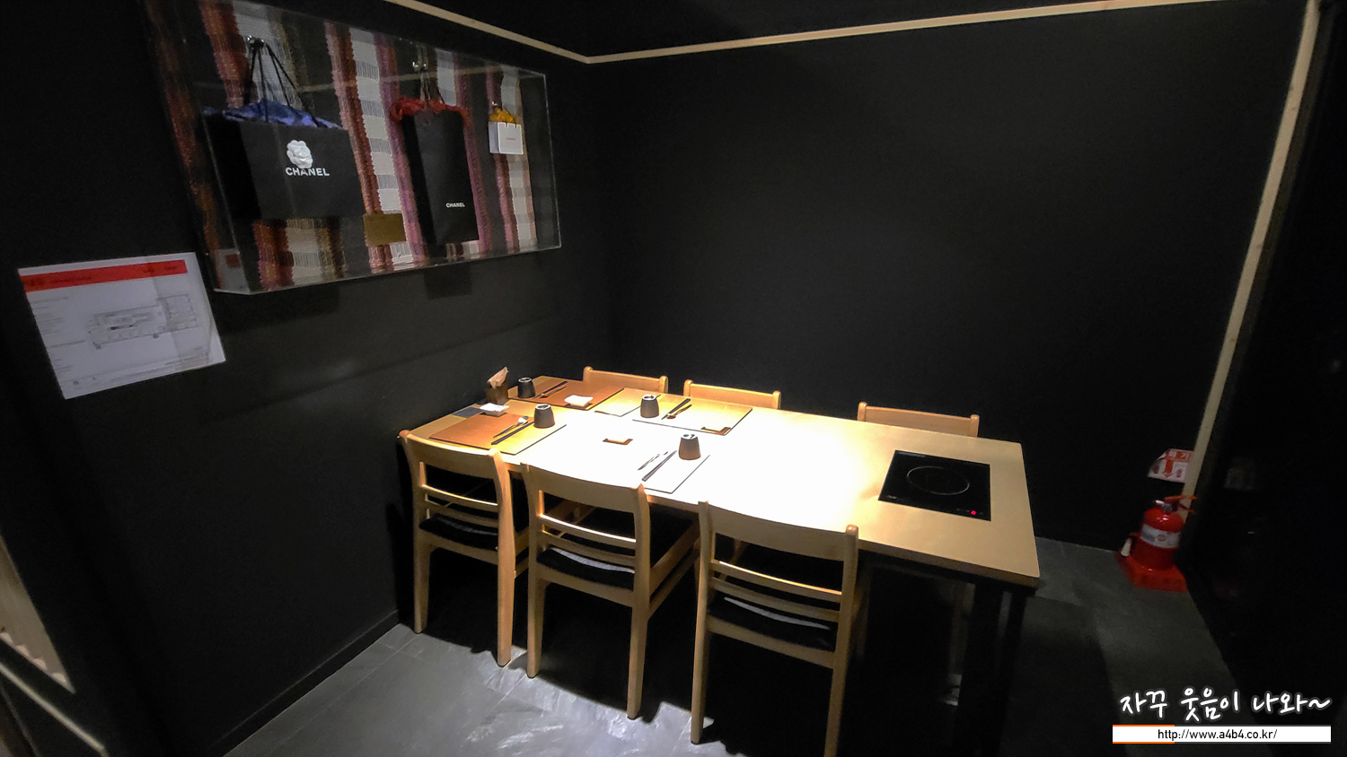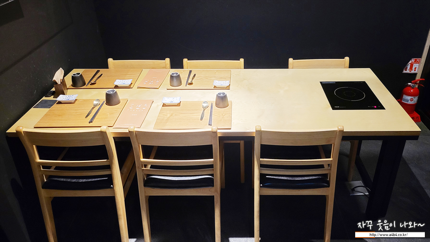 대부분이 룸으로 구성되어 있습니다. 6인 테이블로 세팅된 곳에서 식사 했고요. 각 공간이 가벽으로 되어 있어 확장 가능해 보입니다. 이런 장점이 있지만 상단이 열려 있어서 방음은 전혀되지 않습니다. 저희가 방문했을 때 옆인지 앞인지 회식하는 것 같은데 술좀 드셨는지 다소 시끄럽네요.