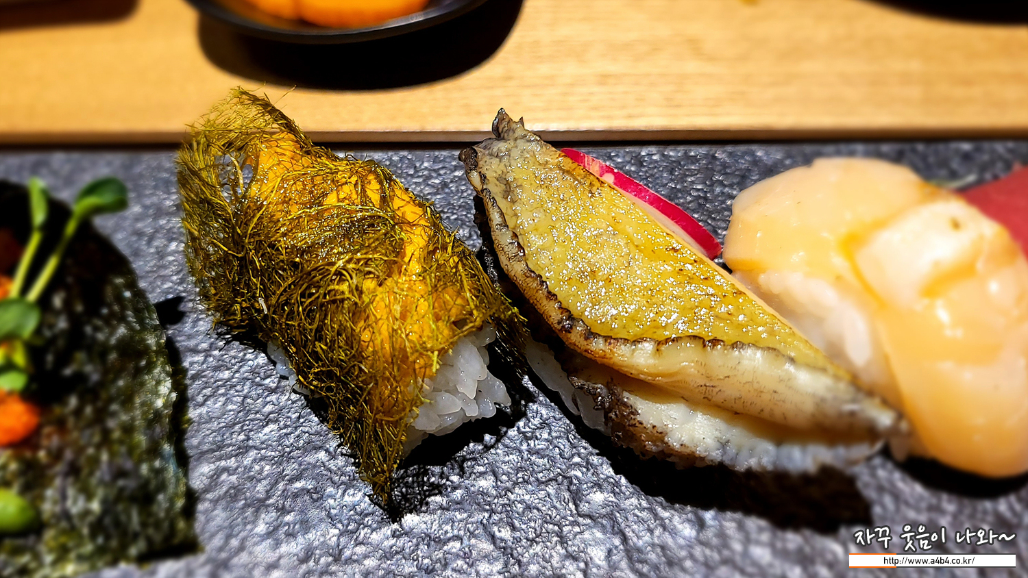 성게알, 전본, 관자, 참치, 고등어? 초밥들이 나왔네요. 12 조각이 한 번에 나왔다면 좀 더 즐겁고 맛있게 초밥을 먹을 수 있지 않았을까 합니다.
