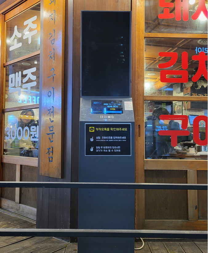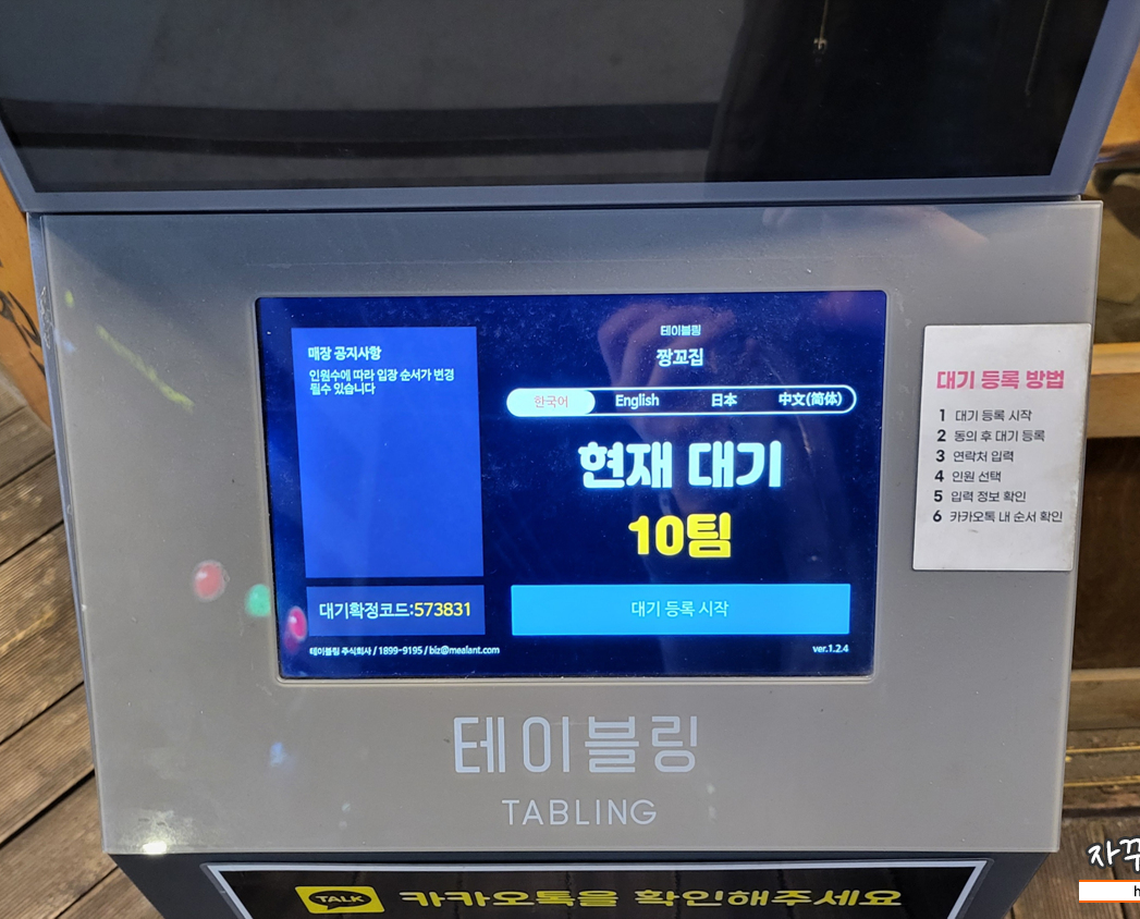제가 평일 저녁에 장꼬집을 방문했는데, 자리는 만석이네요. 그리고 건물 밖에 있는 예약기기를 통해서 예약해야 한다고 합니다. 하필 LG 태블릿은 다운되어 있고, 직원분들 불러 리셋하고 예약합니다. 이름과 전화번호를 입력하면 카카오톡 알림톡을 통해 예약현황 및 안내가 오네요.