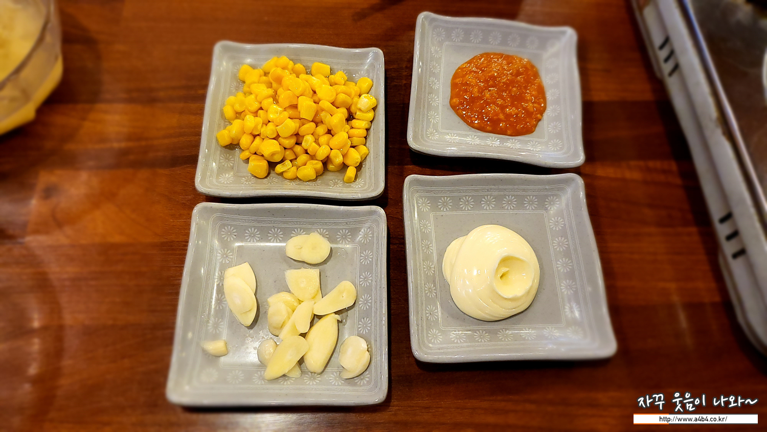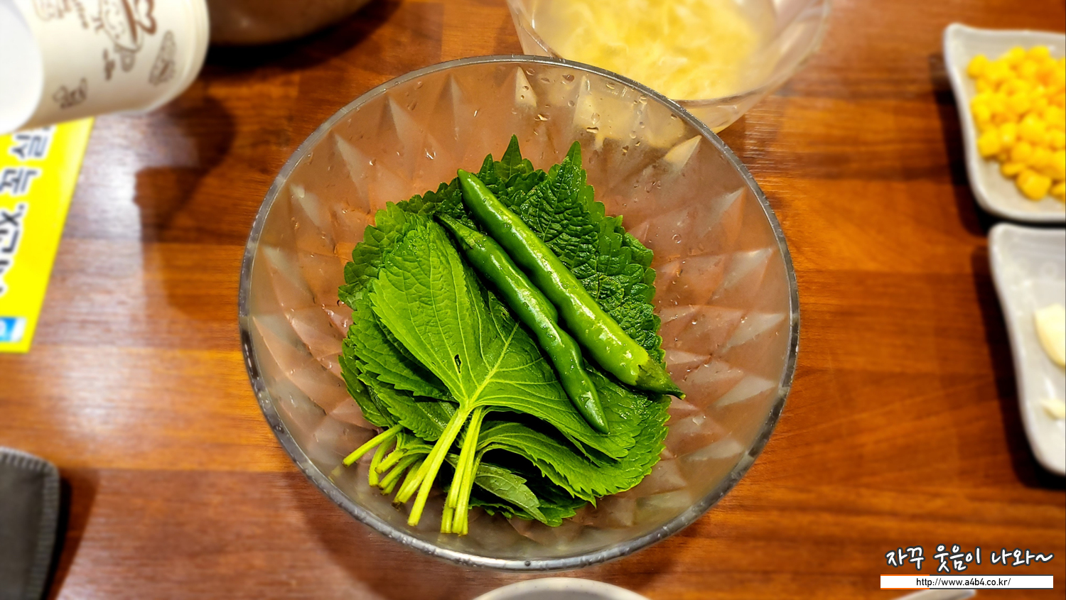 깻잎에, 옥수수, 쌈장, 마늘, 마요네즈를 다 넣고 쌈으로 먹는 방법이 있는데요. 묘한 맛을 보이네요. 이 조합이 나오네요. 짠맛이 조금 적어지네요.