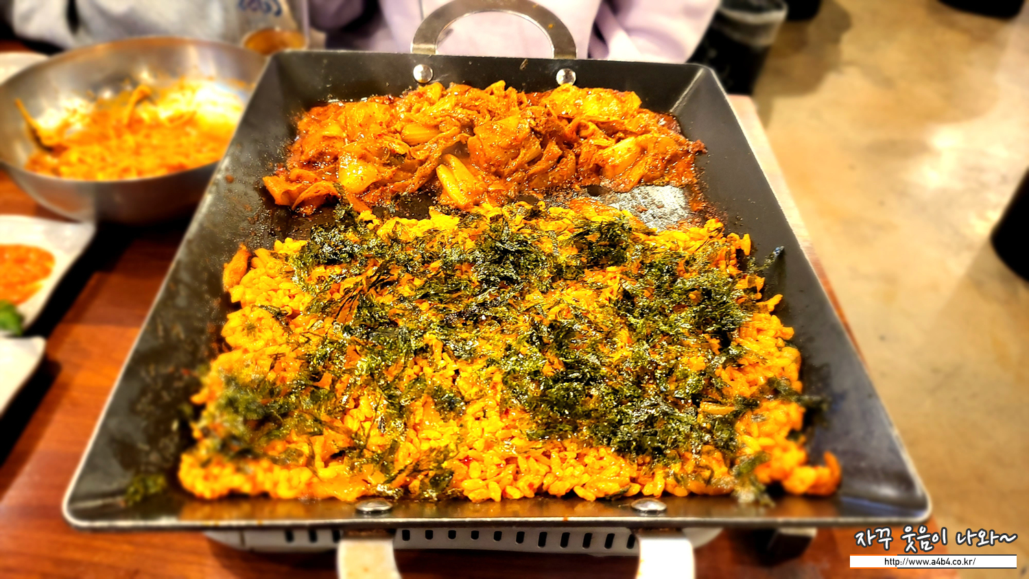 볶음밥과 김가루가 온라간 맛이고요. 돼지 김치구이 국물과 잘 어울리는 맛을 보이네요. 다만 2인 분으로는 다소 아쉬운 양을 보이네요. 다른 곳에서 볶음밥 2인 분 주문하면 상당히 푸짐하다고 느끼는데, 그렇지는 않네요.