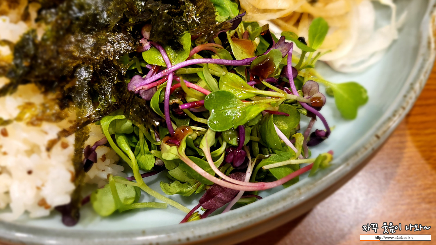 한 쪽에는 소스가 올라간 생양파가, 그리고 다른 한쪽에는 이런 새싹채소가 올려 있습니다.