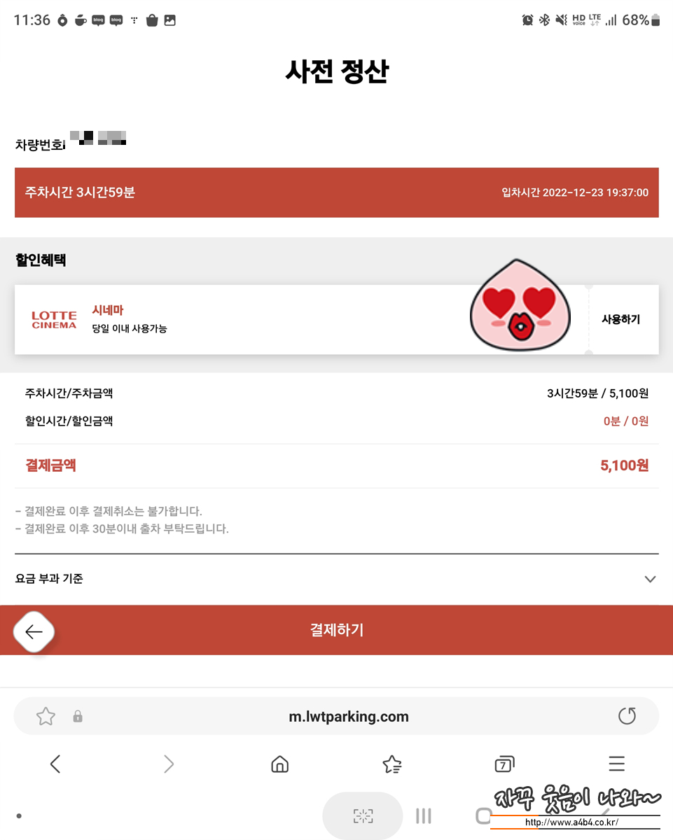 참고로 정산 후 30분 이내에 출차하면 추가 주차요금이 발생하지 않으니, 영화 상영이 끝나고 바로 사전정산 하시고 이동하셔도 무방해 보입니다.