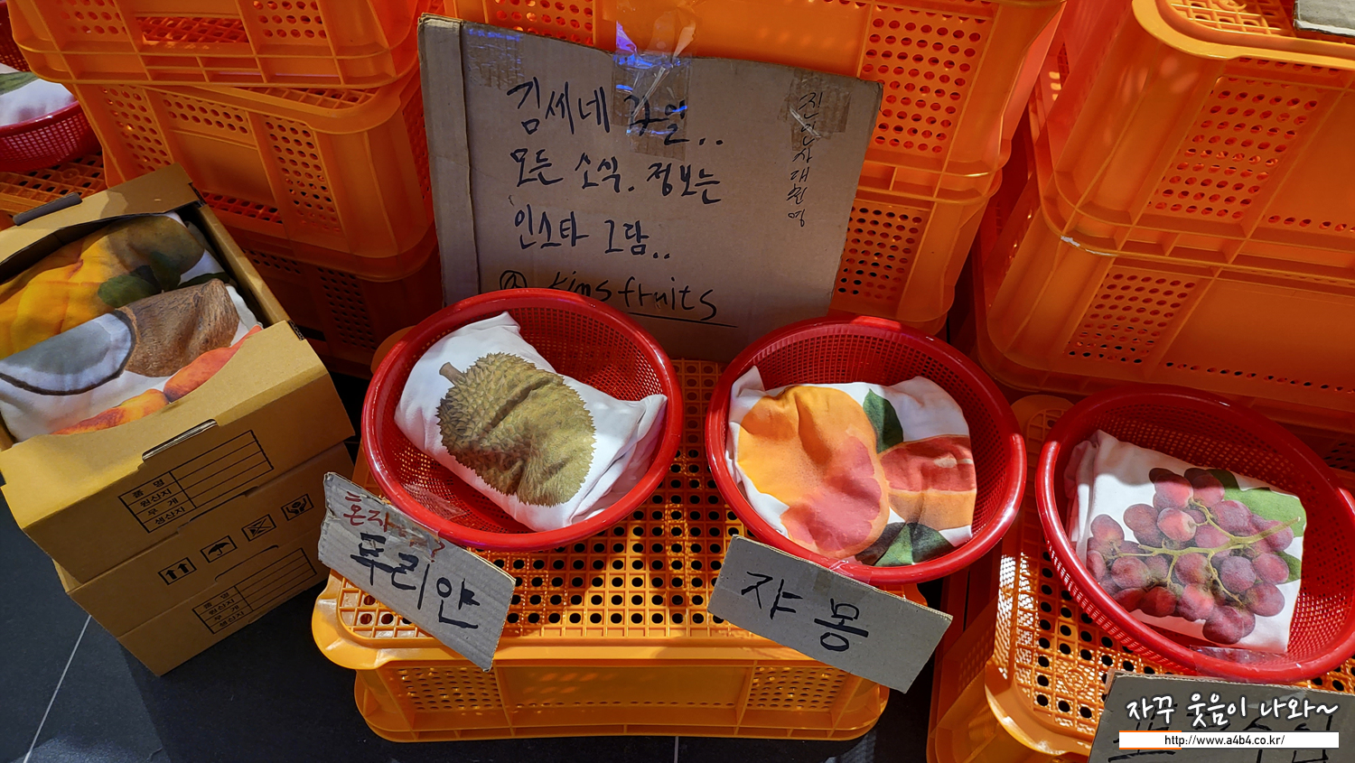 먼저 김씨네 과일을 유명하게 만든 독특한 이름의 티셔츠 들이 전시되어 있고요.