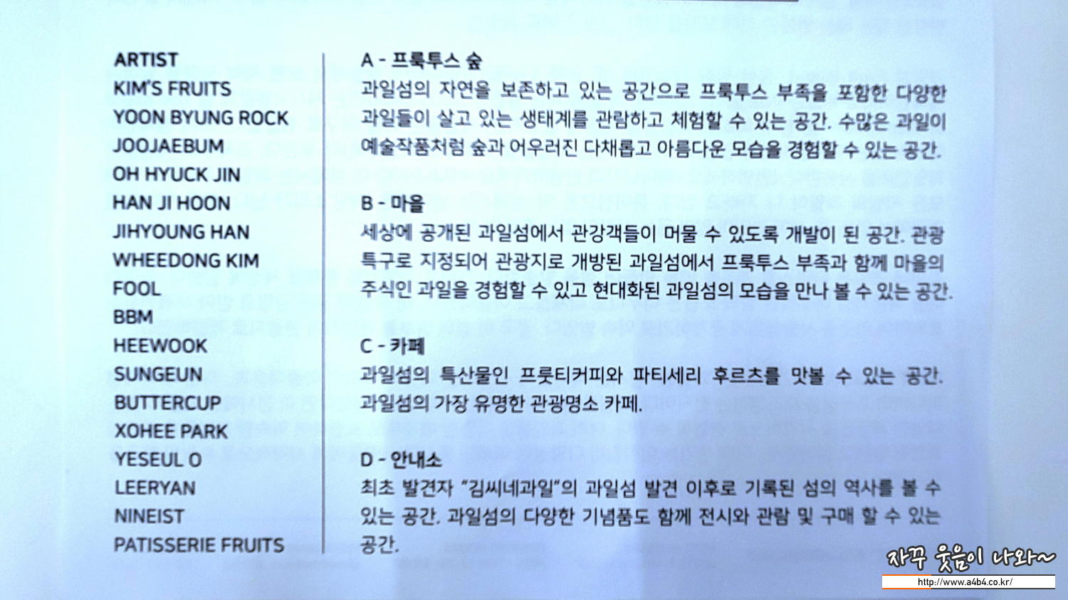 이번 과일섬 전시회는 4개의 공간으로 구성되어 있습니다.