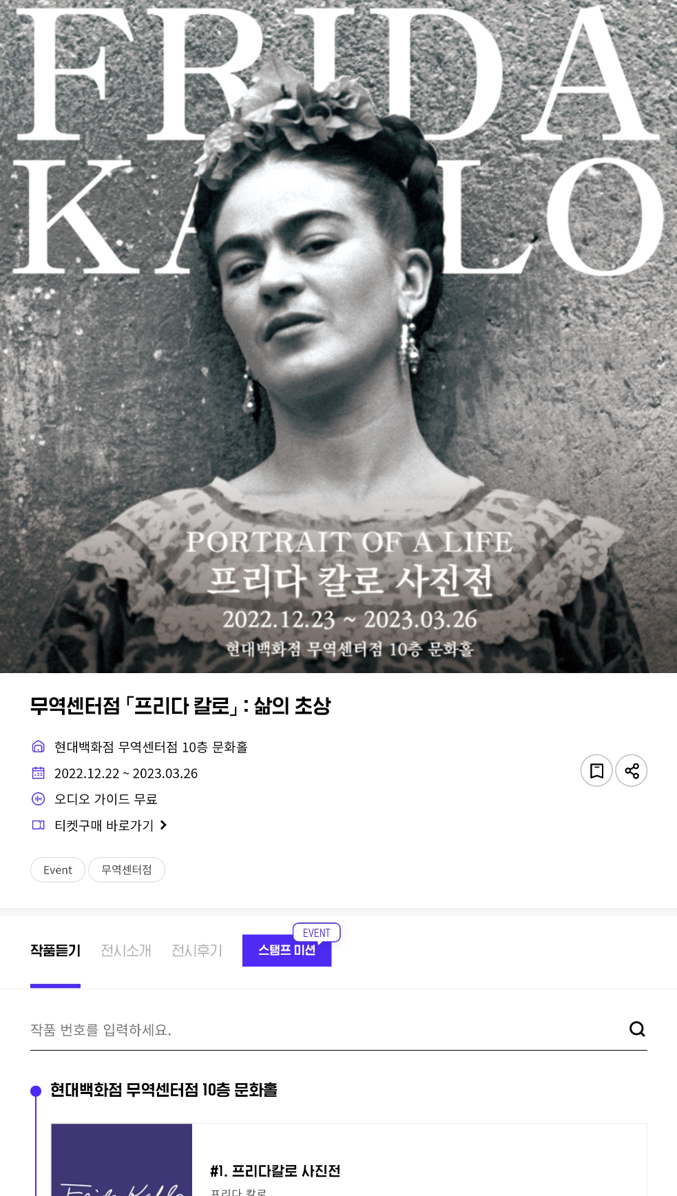 저는 프리다 칼로 사진전 얼리버드 티켓팅을 통해 50% 할인된 9천원에 관람했네요. 참고로 전시회 주차창은 무역센터 현대백화점을 이용하면 되며, 관람객은 2시간 무료주차가 지원됩니다.
