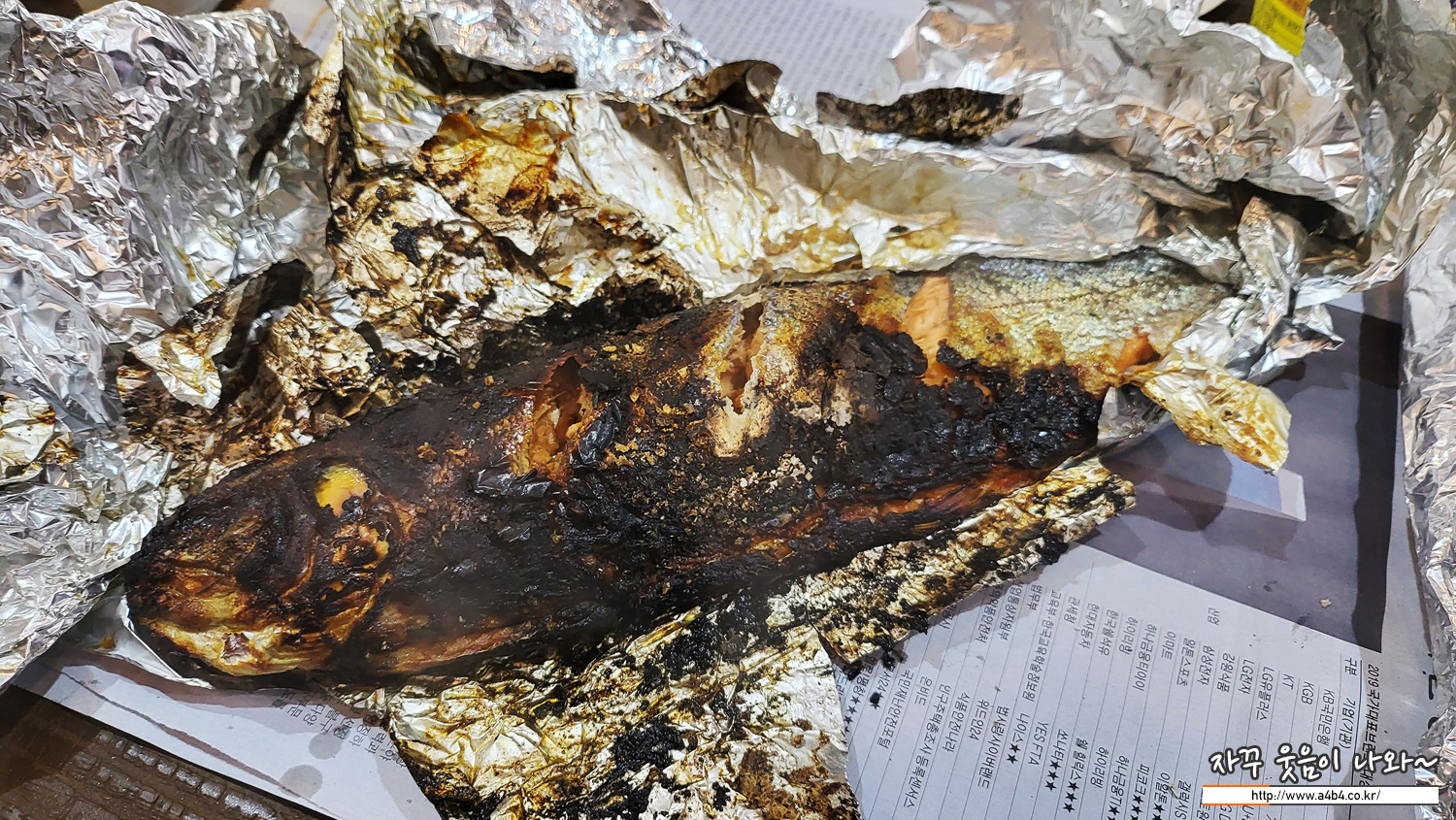 15분 보다 조금 늦게 같습니다. 여러 송어, 산천어 축제장을 다니다 보니 터득한 팁이라고 할까요. 조금 겉이 타게 하면 속살이 잘 익어서 맛있습니다. 너무 시간에 딱 맞춰 가면 안쪽이 약간 비리거나 덜 익은 경우가 있어서요.