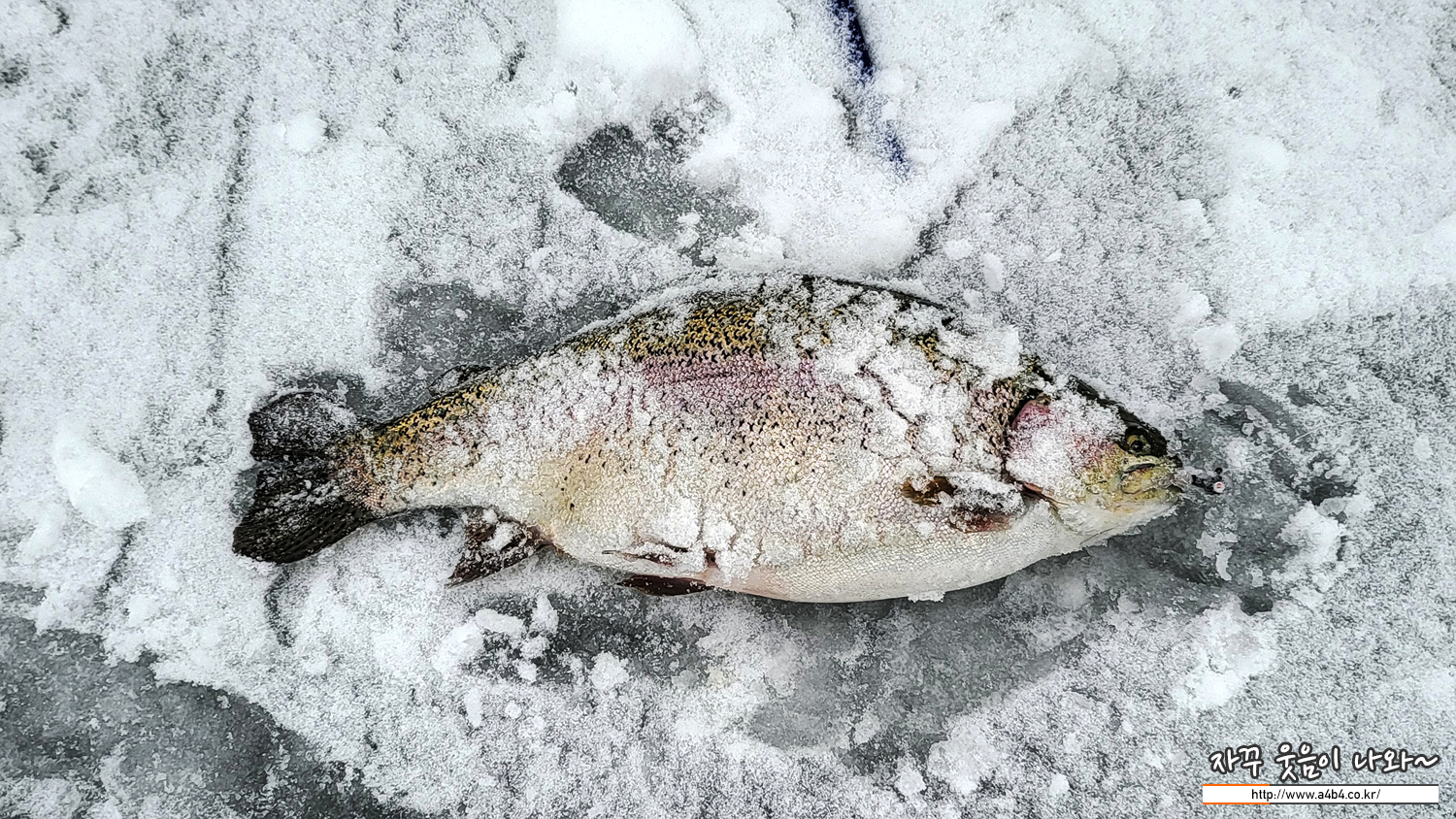 두 얼음구멍을 비교해 보시면 아실 듯, 지난 송어축제는 얼름구멍 아래로 바닥이 다 보일 정도로 투명한 물색을 보였습니다. 이 아래로 송어들이 다니는 것도 다 보이고, 채비와 미끼도 다 보여서 쉽게 낚시를 할 수 있었는데요.