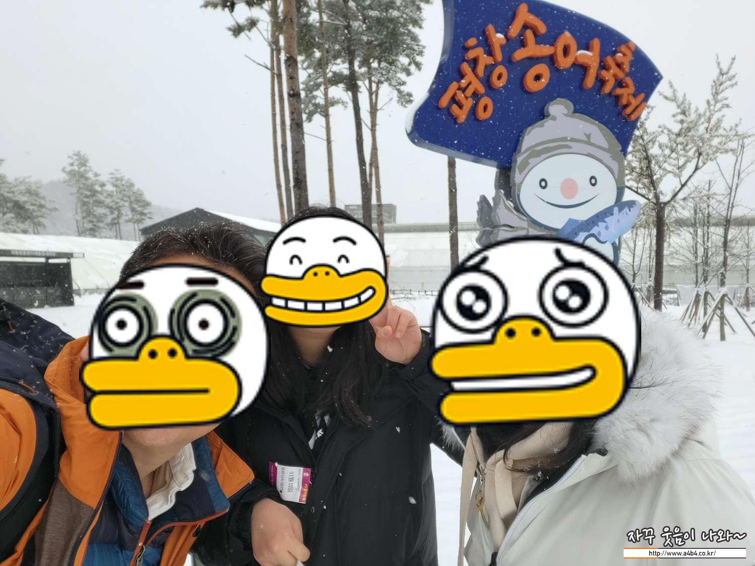 입구의 행사장 표지만과 눈사람, 그리고 송어 조형물 앞에서는 인증사진 꼭 찍으세요.