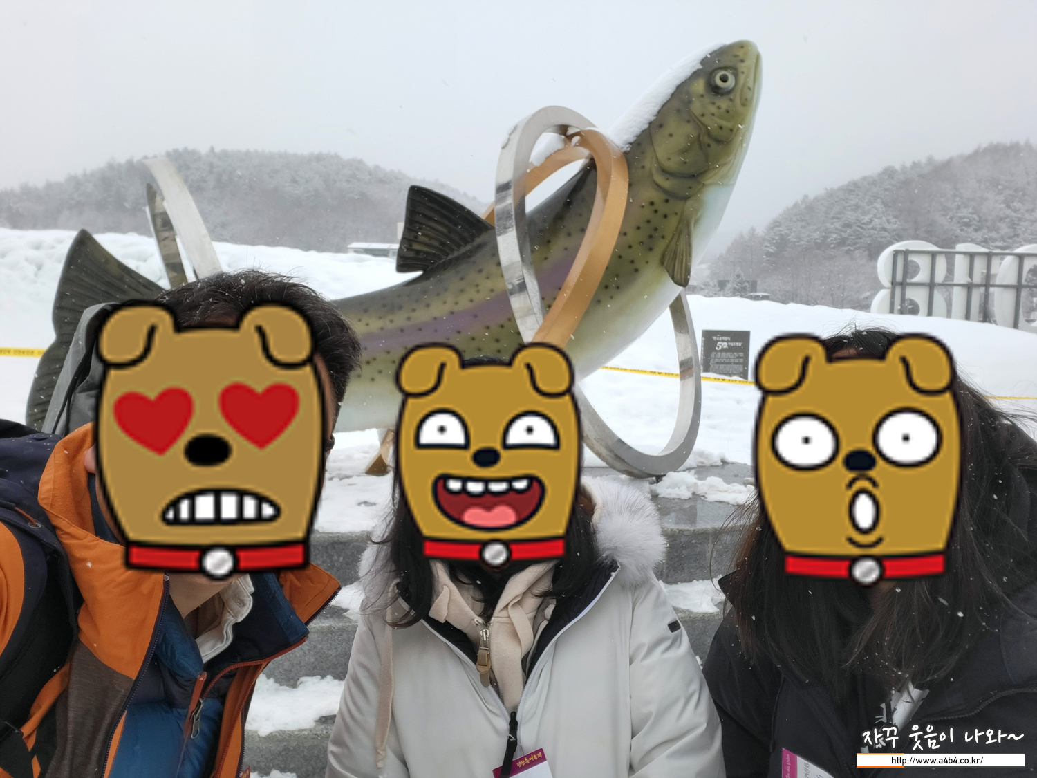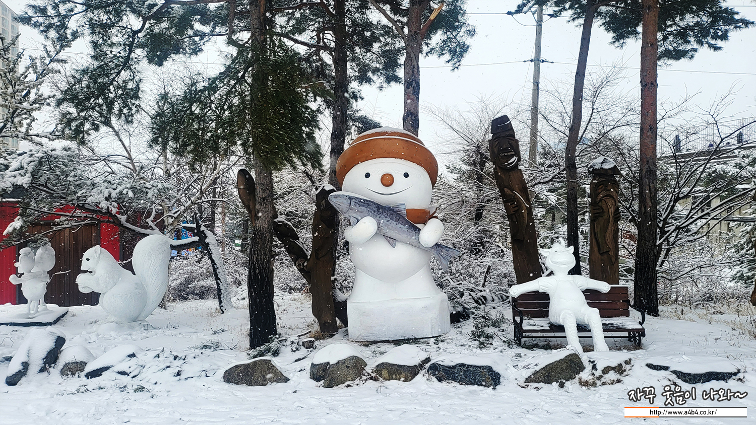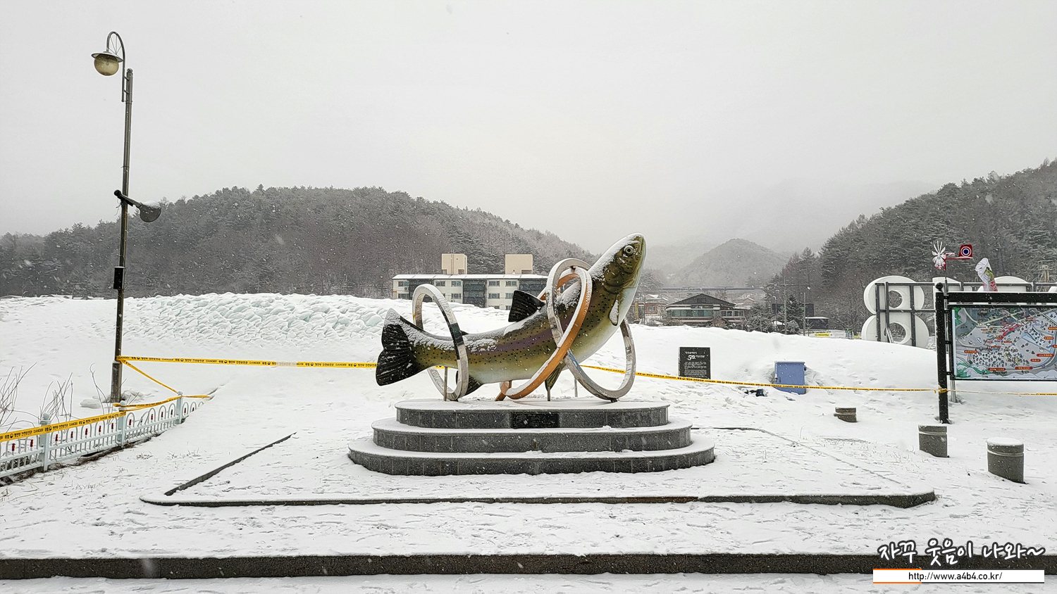 입구의 행사장 표지만과 눈사람, 그리고 송어 조형물 앞에서는 인증사진 꼭 찍으세요.