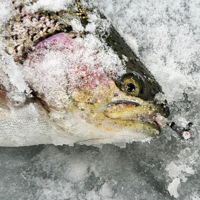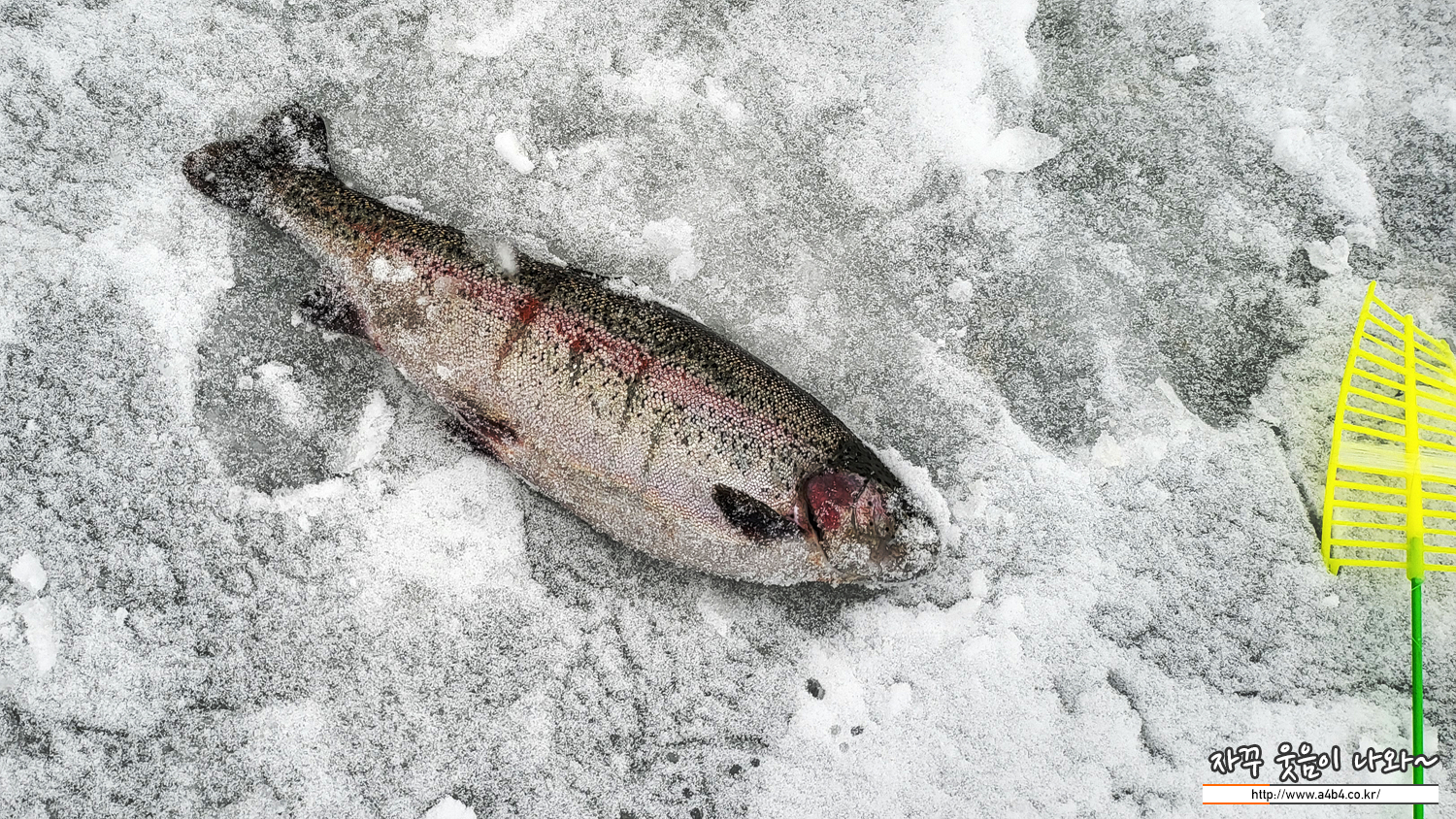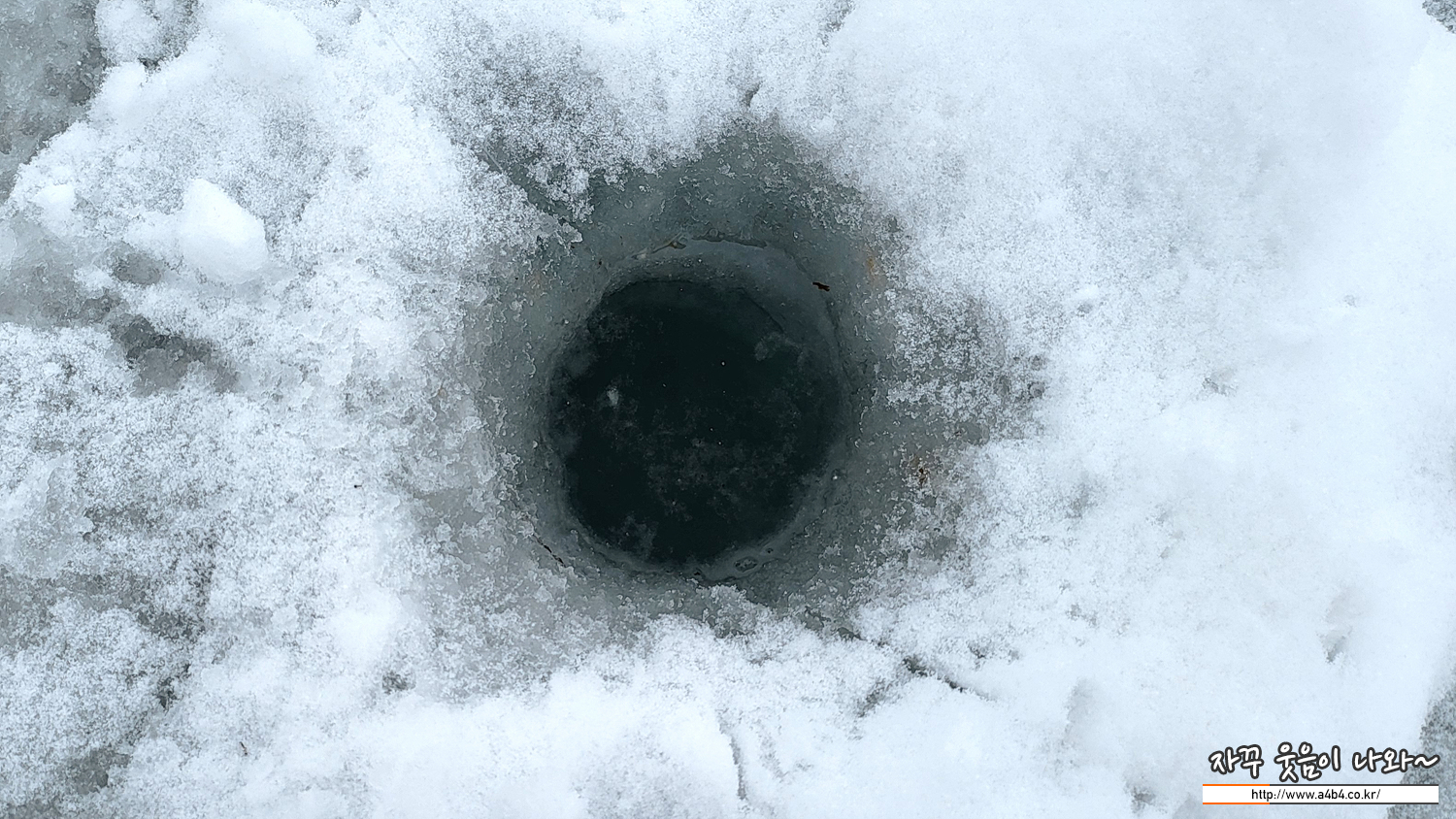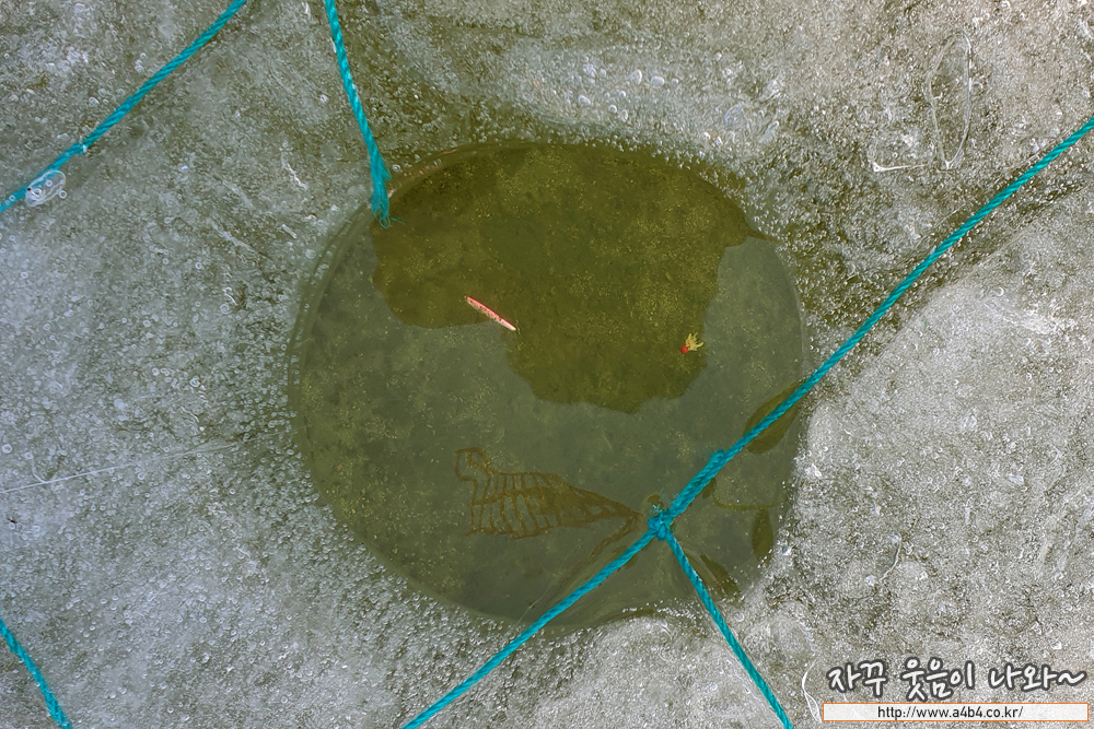 두 얼음구멍을 비교해 보시면 아실 듯, 지난 송어축제는 얼름구멍 아래로 바닥이 다 보일 정도로 투명한 물색을 보였습니다. 이 아래로 송어들이 다니는 것도 다 보이고, 채비와 미끼도 다 보여서 쉽게 낚시를 할 수 있었는데요.