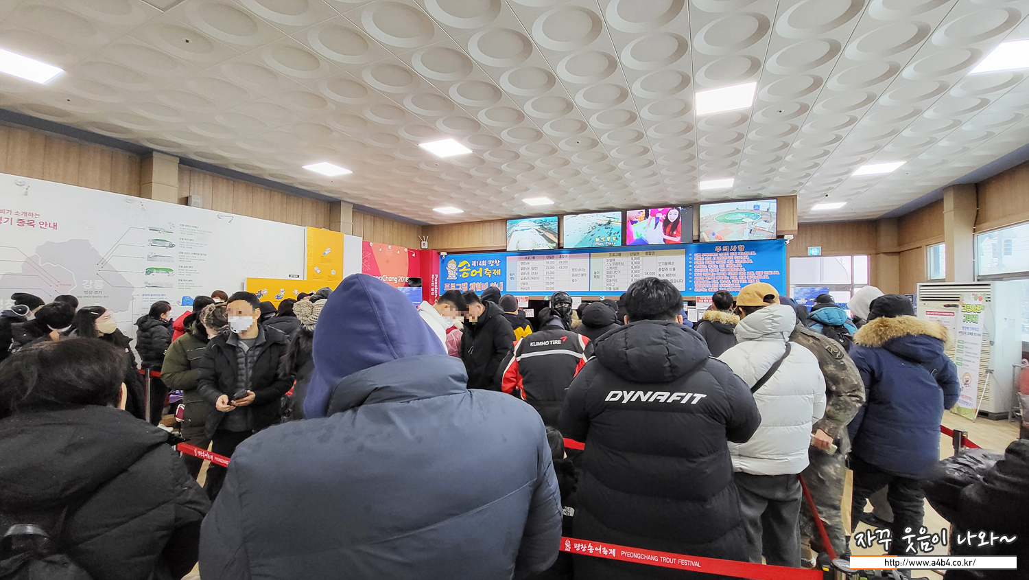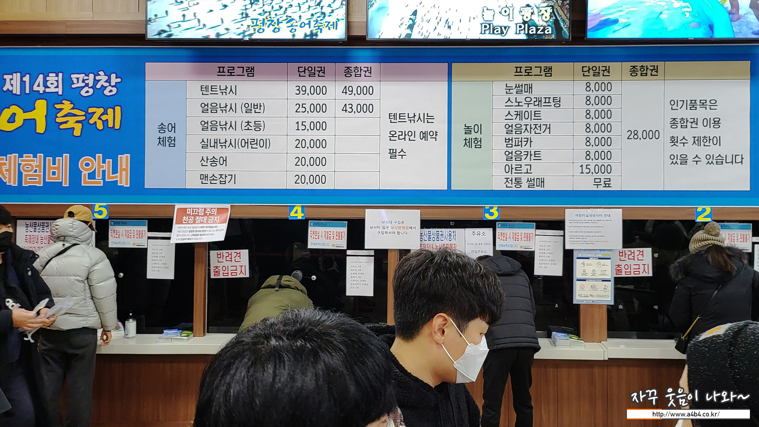 티켓팅 하고 평창 송어축제 행사장으로 이동합니다. 티켓팅과 입장은 오전 9시부터 열리고요. 발권 후 낚시터로 입장이 가능하니, 이곳 티켓팅 장소에서만 대기하시면 됩니다. 다만 명당자리 차지를 위해서는 오전 8시 전에는 오셔야 가능해 보이네요. 참고로 평창 송어축제장은 반려견 강아지 출입금지 입니다.
