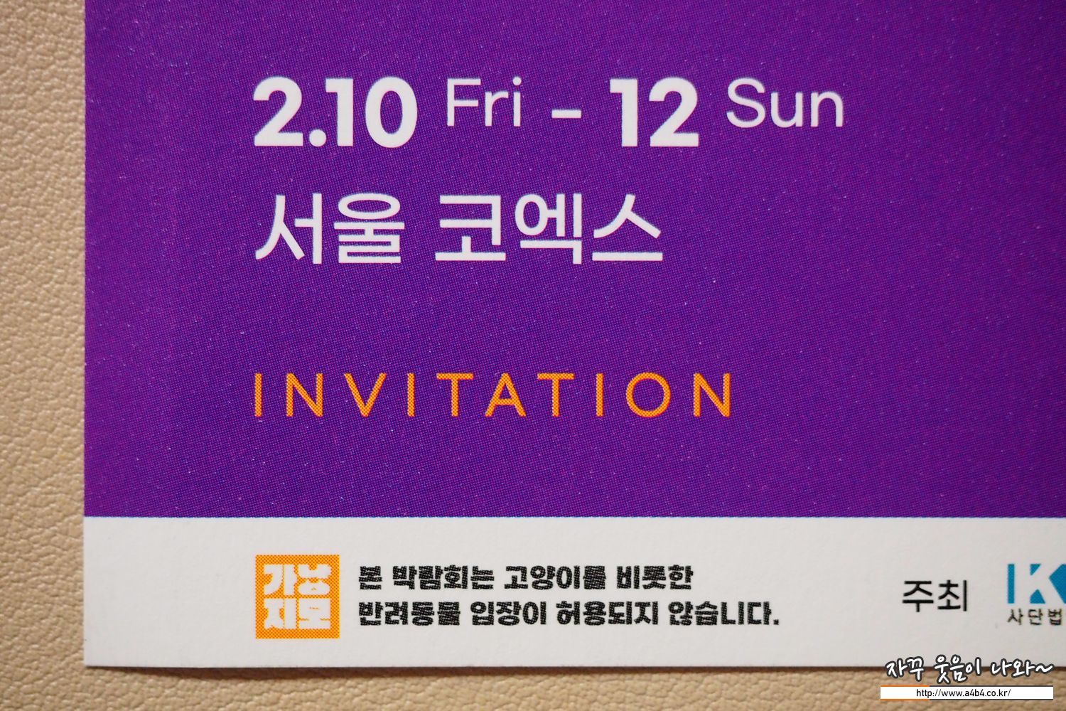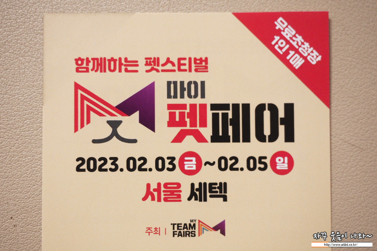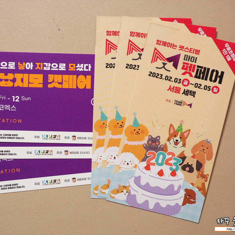 마이펫페어 서울 행사는 공식홈페이지를 통해 사전등록 시 무료입장이 가능하여, 단골 동물병원에도 초대권이 비치되어 있네요. 현장등록 시 성인 : 5,000원, 학생(중/고등) : 3,000원 이네요. 돈 쓰러 가는데, 입장료까지 내고 들어가기는 좀 그렇죠? 마이펫페어 사전등록 바로 하세요.