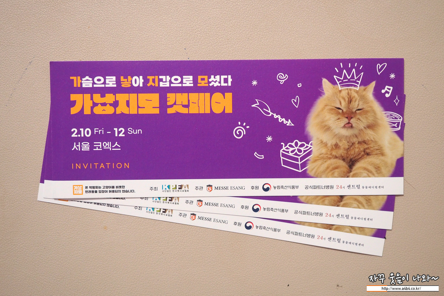 아래 가낳지모 캣페어 공식 홈페이지에서 사전예약 하시면 50% 할인된 5,000원에 예약이 가능합니다만, 동물병원 등에 무료 초대권이 많이 풀려 있다고 합니다.
