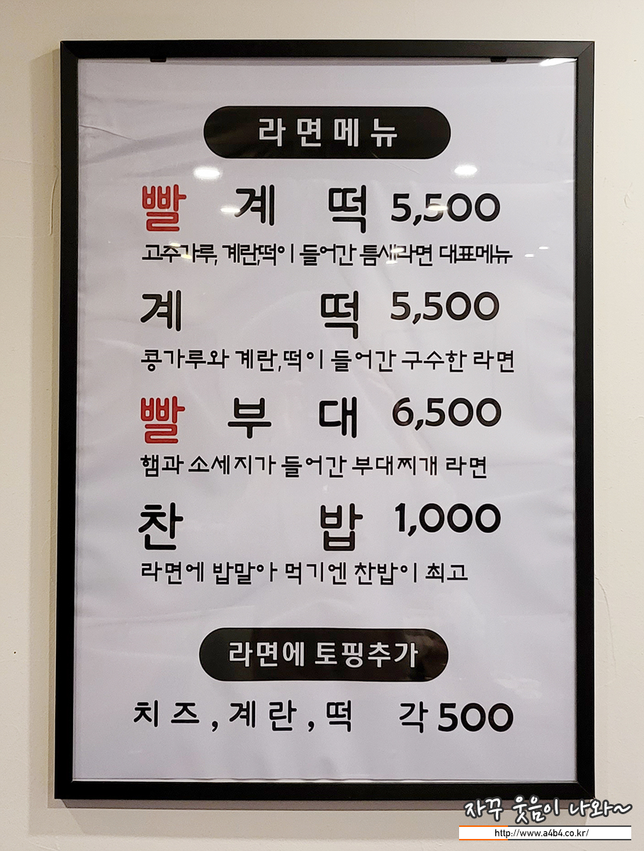 잠실 맛집 장안정에서는 세가지 종류의 틈새라면이 준비되어 있습니다. 매운맛 라면과 부대라면, 그리고 순한맛 라면을 맛볼 수 있네요. 저는 계란과 떡이 들어간 계떡 주문합니다.
