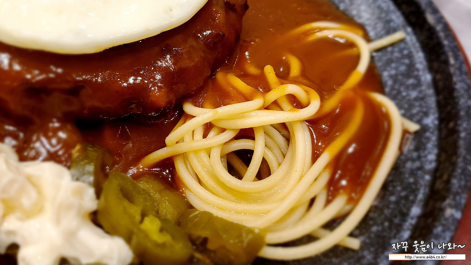 함박스테이크와 마카로니, 스파게티, 피클이 세팅되어 나옵니다. 함박스테이크 위에 얹어진 계란프라이가 인상적인...