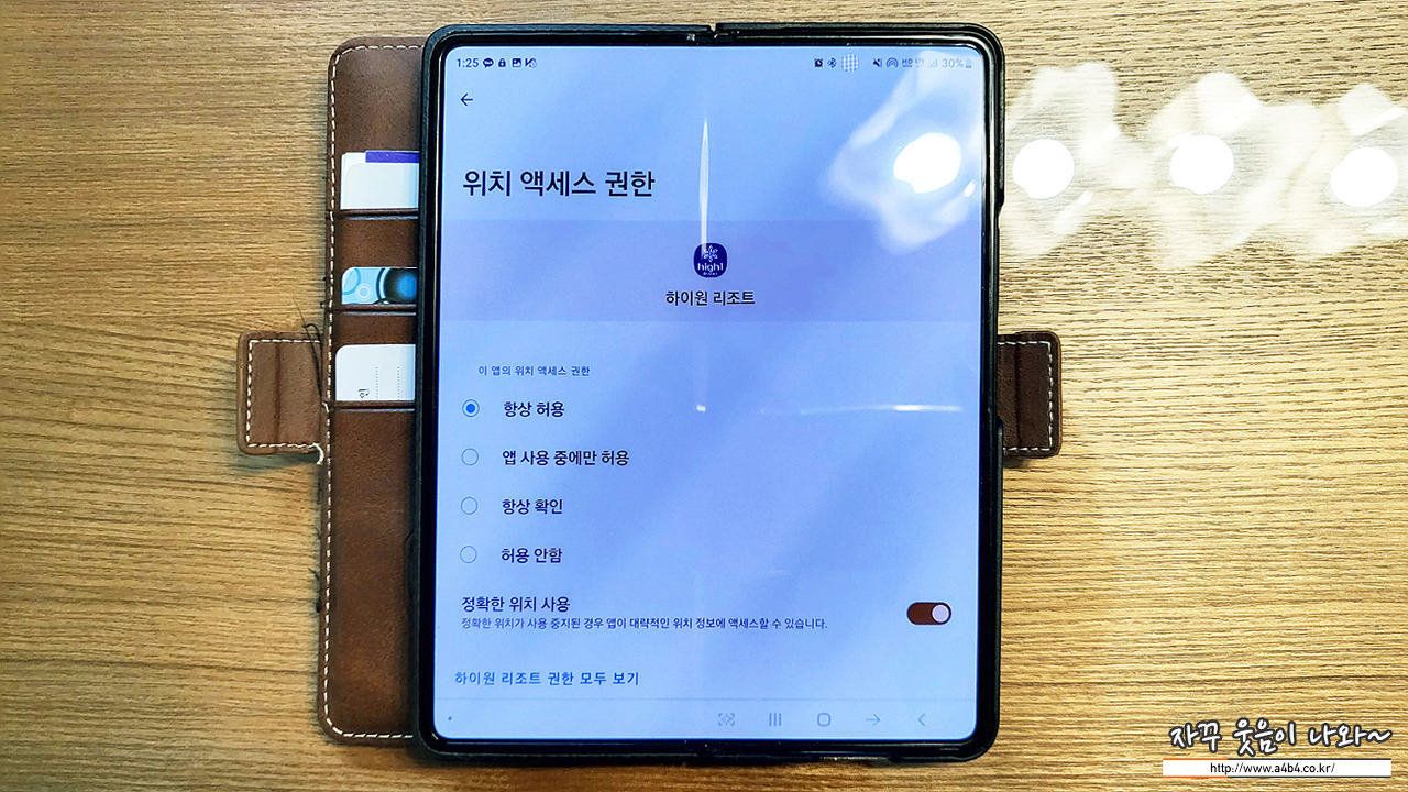 하이원 펫클럽은 물리적인 출입키가 없습니다. 고객 스마트폰에 하이원 앱을 설치하고 GPS와 블루투스를 이용해서 문의 전자도어와 통신하는 방식입니다. 상당히 편해 보이지만 그렇지는 않고요. 비대면 방식으로 인건비 절감이 더 커 보입니다. 특히 하이원 앱에 위치 액세스 권한을 '항상허용'으로 설정해야 월활하게 작동하네요. '가장 싫어하는 옵션인데요' 퇴실하면 바로 삭제하려 합니다.