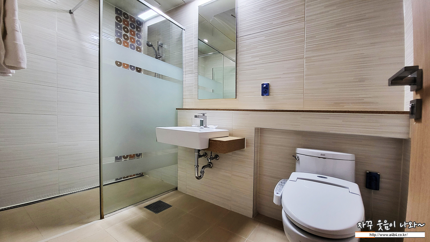 거실에 화장실이 하나 더 있습니다. 욕조는 없고요. 샤워부스가 설치된 화장실입니다.
