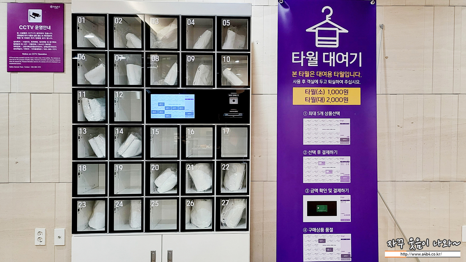 수건은 총 5장이 있고요. 추가로 타월이 필요하다면, 1층 타월 대여기에서 유상으로 대여가 가능합니다. 사실 1박 2일 이어도 타월 5장은 항상 부족하다는 생각입니다. 항상 여분의 수건을 챙겨오지만, 급하면 이곳 이용하는 것도 좋아 보이네요.
