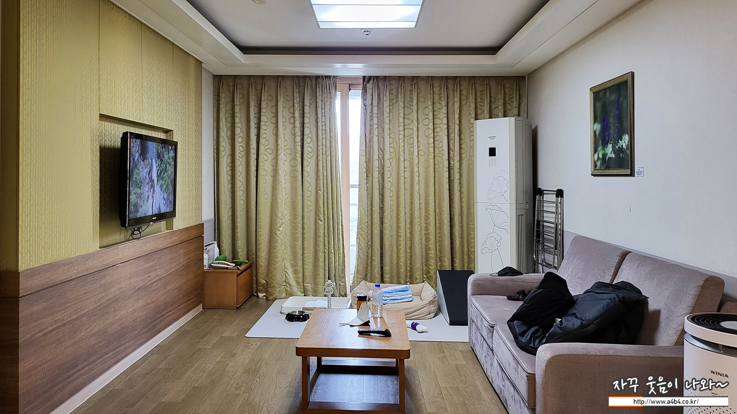 거실은 전반적으로 무난합니다. 다만 TV가 아닌 케이블 TV가 설치되어 있네요. 편성표 확인도 어렵고 익숙하지 않네요.