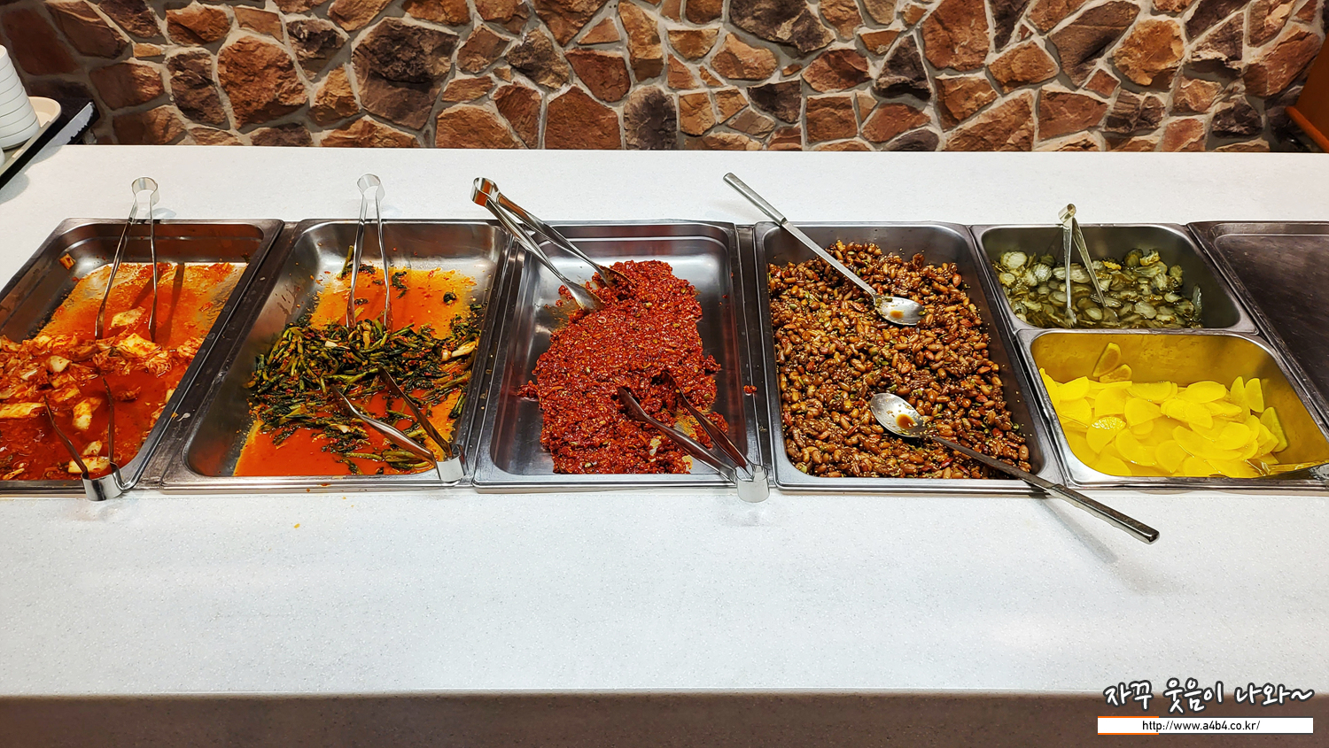 김차와 젖갈, 견과류 조림과 단무지, 피클 등 여섯가지 반찬이 준비되어 있습니다. 셀프로 필요한 만큼 가지고 갈 수 있습니다.