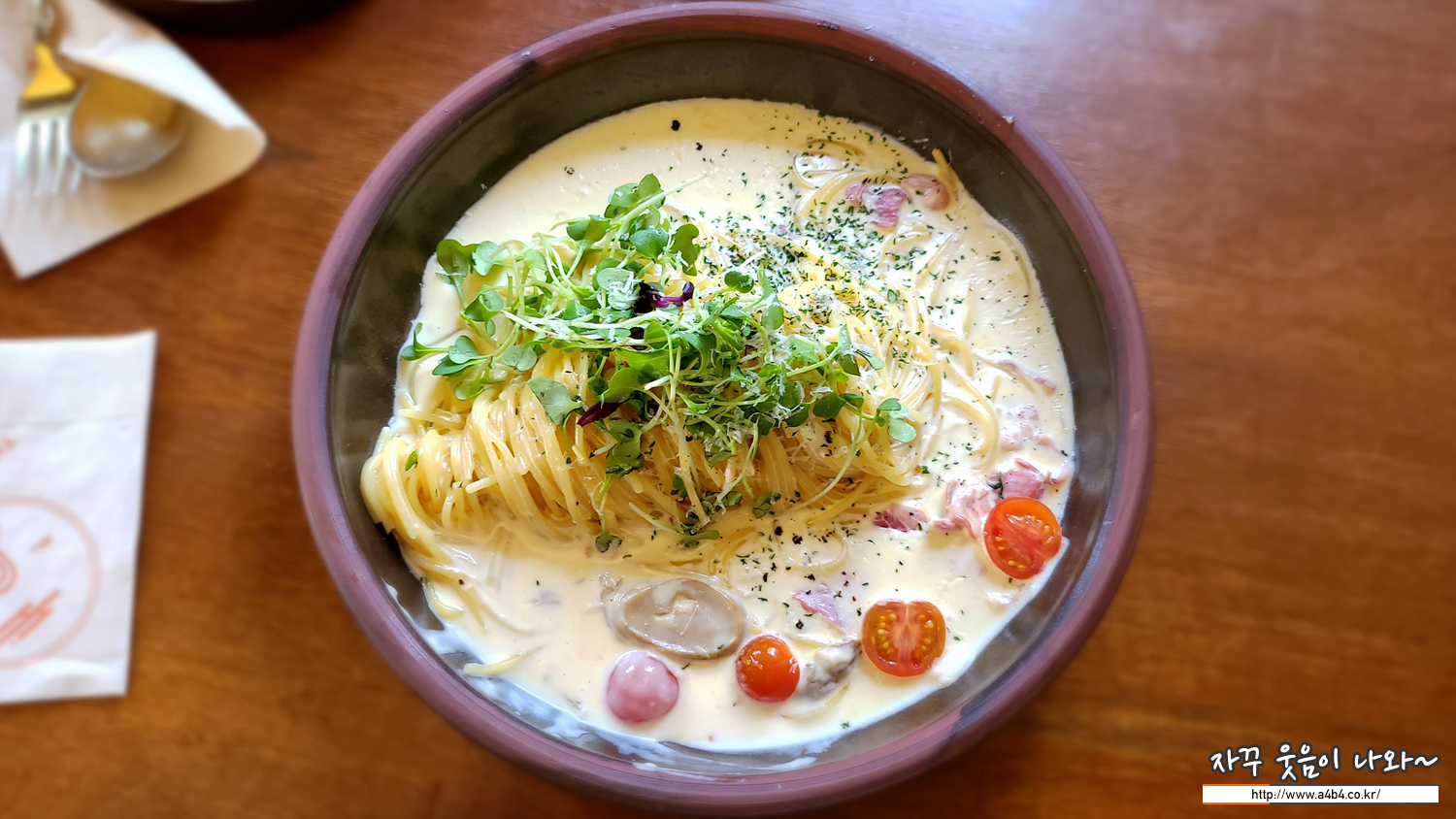 시작에서 말했듯이 이곳 서울 강아지 동반 식당인 사생활은 파스타 브런치 전문 레스토랑입니다. 다양한 파스타와 리조또가 준비되어 있는데요. 오늘은 베이컨 크림 파스타 주문합니다. 딸아이는 고소한 맛으로 좋아하지만, 저는 가끔 해장용으로 즐겨먹는 메뉴이기도 하네요.