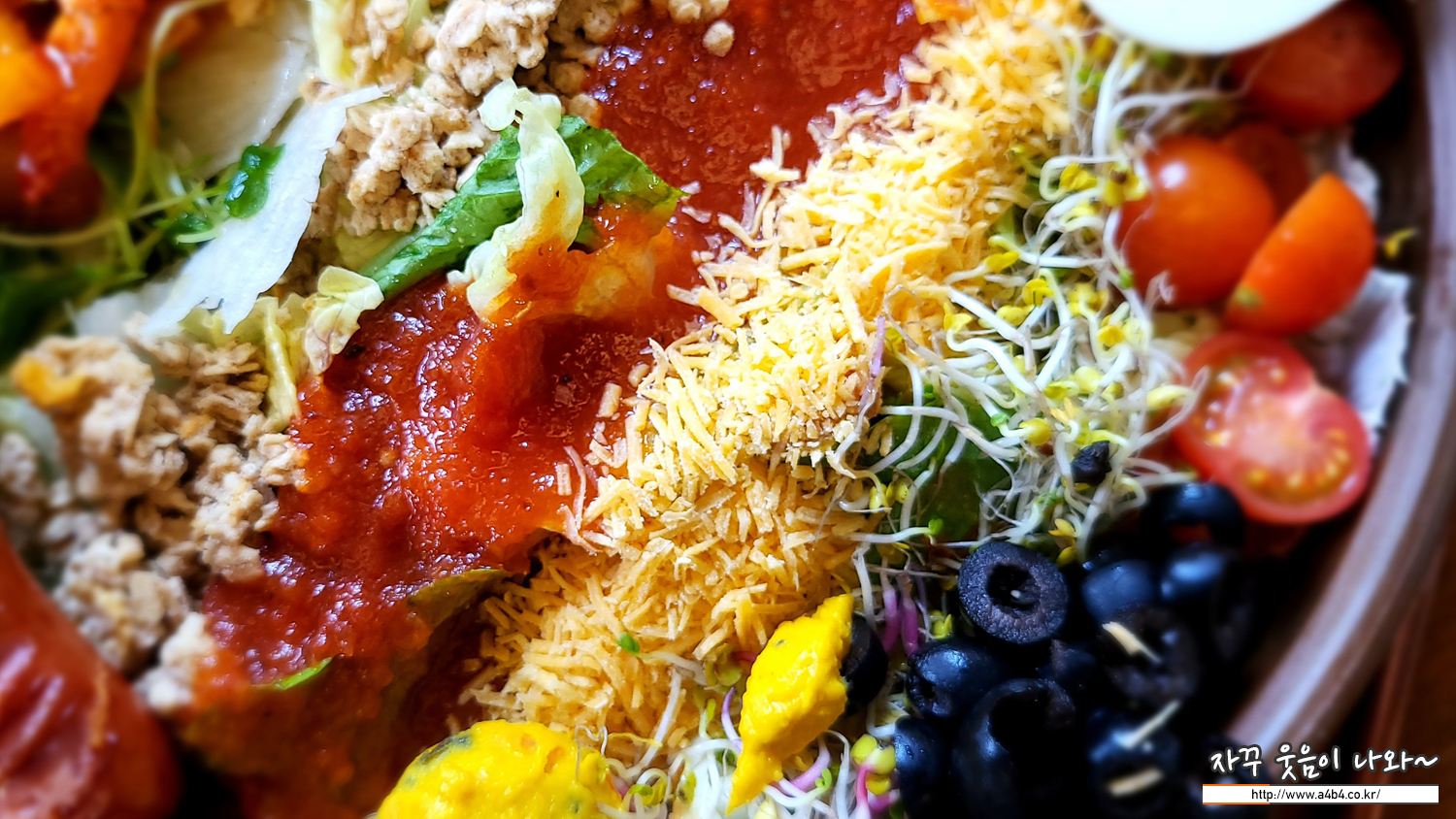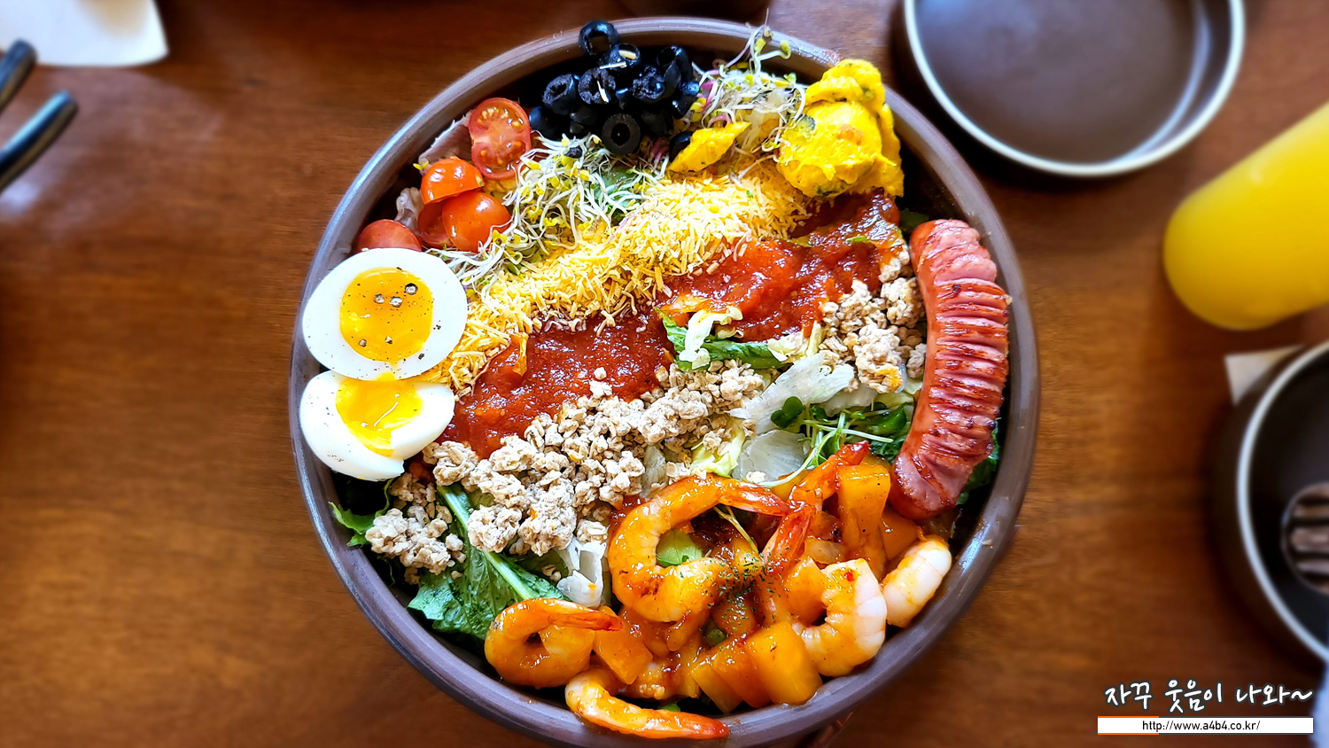 올리브나 새싹채소, 샐러드 야채는 물론 칠리새우도 푸짐하게 들어 있네요. 저는 가족이 각각 단품메뉴 준비하고 이 샐러드 하나 가볍게 나누어 먹으려고 했는데. 생각보다 푸짐하고 맛도 있습니다. 1.5명 식사로도 충분한...