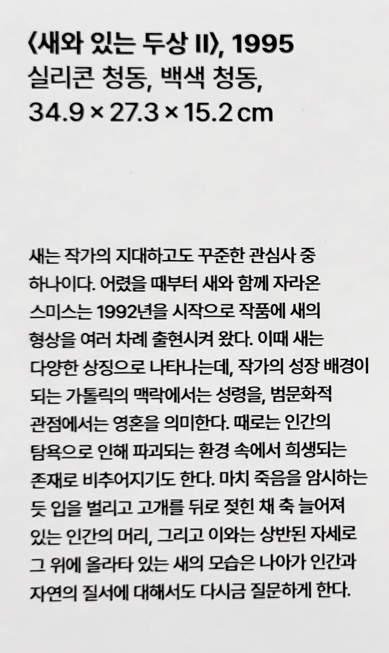 새는 키키 스미스의 꾸준한 관심사 중 하나입니다. 어렸을 때부터 새와 함께 자라온 스미스는 1992년을 시작으로 작품에 새의 형상을 여러 차례 출현시켜 왔습니다. 작품에서 새는 다양한 상징으로 나타나는데, 작가의 성장 배경이 되는 가톨릭의 맥락에서는 성령을, 범문화적 관점에서는 영혼을 의미하기도 합니다. 때로는 인간의 탐욕으로 인해 파괴되는 환경 속에서 희생되는 존재로 비추어지기도 합니다. 마치 죽음을 암시하는 듯 입을 벌리고 고개를 뒤로 젖힌 채 축 늘어져 있는 인간의 머리, 그리고 이와는 상반된 자세로 그 위에 올라타 있는 새의 모습은 나아가 인간과 자연의 질서에 대해서도 다시금 질문하게 합니다.