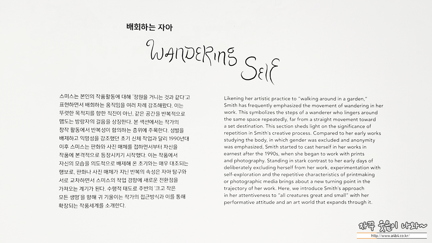 스미스는 본인의 예술 활동을 일종의 ‘정원 거닐기’라 칭했습니다. 이는 여러 매체와 개념을 맴돌며 경계선 언저리에서 사유하는 배회의 움직임에 대한 상징이기도 합니다. 그리고 이러한 움직임은 소외되거나 보잘것없는, 혹은 아직 닿지 않은 모든 생명에 대한 경의의 메세지를 담아 오늘도 작품으로 여실히 옮겨지고 있습니다. 1980-1990년대를 거쳐 현재에 이르기까지 시대의 굴곡을 유영해 온 스미스는 “나는 여전히 자유낙하 중이다.”라고 말합니다. 느리고 긴 호흡으로 주변의 ‘크고 작은 모든 생명’에 귀 기울이며 상생의 메시지를 던지는 스미스의 태도야말로 과잉, 범람, 초과와 같은 수식어가 익숙한 오늘날 다시 주목해야 할 가치일 것입니다.