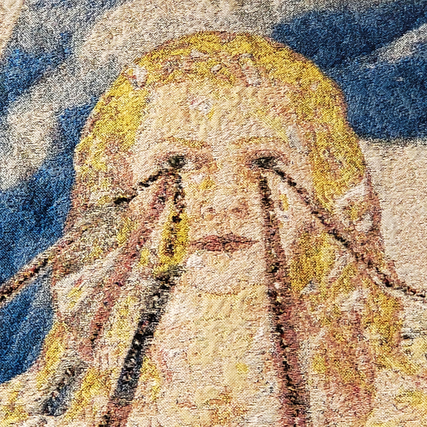 <푸른 소녀>는 성모 마리아를 소녀상으로 제작한 작품으로, 키키 스미스가 1994년 이스라엘 박물관에서 개인전을 준비하던 시기에 예루살렘 시내에서 마주친 소녀를 그 시작으로 합니다. 스미스는 소녀를 실물 크기로 본떠서 <붕대를 감은 소녀>라는 작품을 만들었고, 이후 동일한 캐스트를 활용하여 성모 마리아를 소녀로 표현했습니다. 두 팔을 곧게 뻗은 자세는 성모 마리아의 전통적인 제스처로, 기도, 경외, 축복을 의미합니다. 소녀를 주변으로 흩어져 있는 불가사리들은 밤하늘의 별을 연상시키는데 여기서 장식성에 대한 스미스의 깊은 관심을 엿볼 수 있습니다.