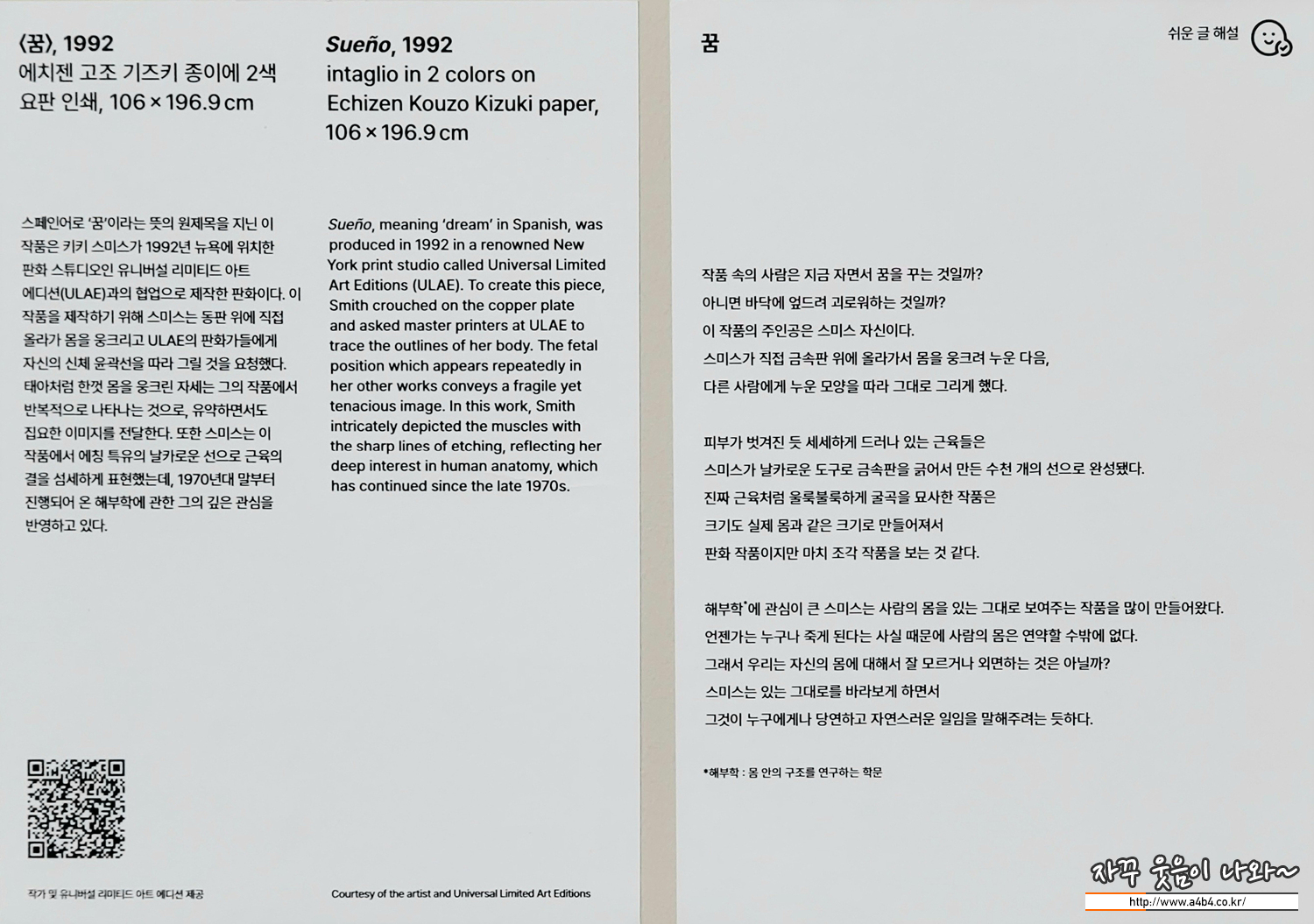 스페인어로 '꿈'이라는 뜻의 원제목을 지닌 이 작품은 키키 스미스가 1992년 뉴욕의 판화 스튜디오인 유니버설 리미티드 아트 에디션(ULAE)과의 협업을 통해 제작한 판화입니다. 이 작품을 제작하기 위해 스미스는 동판 위에 직접 올라가 몸을 웅크리고 ULAE의 판화가들에게 자신의 신체 윤곽선을 따라 그릴 것을 요청했습니다. 태아처럼 한껏 몸을 웅크린 자세는 그의 작품에서 반복적으로 나타나는 것으로, 유약하면서도 집요한 이미지를 전달합니다. 또한 스미스는 이 작품에서 에칭 특유의 날카로운 선으로 근육의 결을 섬세하게 표현했는데, 1970년대 말부터 진행되어 온 해부학에 관한 그의 깊은 관심을 엿볼 수 있습니다.