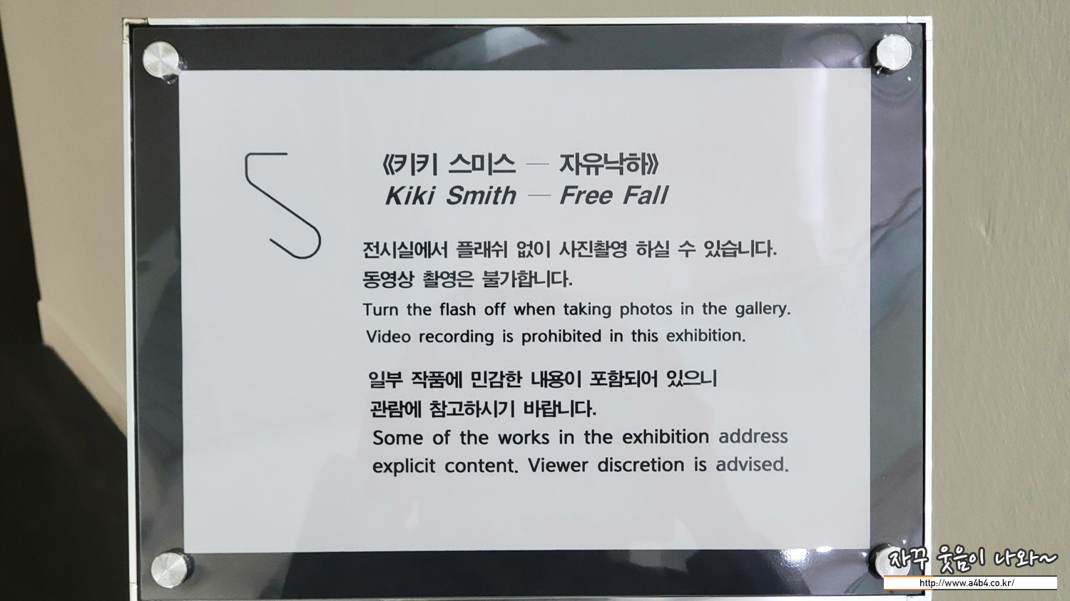 키키 스미스 전시회는 사진촬영이 가능합니다. 전시 공간은 여유있고 사진 촬영하기에도 좋은 작품들도 있습니다. 아래 안내와 같이 관람객 개인에 따라 다소 민감한 내용의 작품도 있습니다.