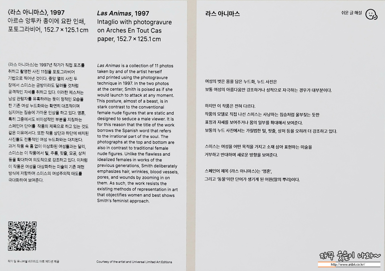 <라스 아니마스>는 1997년 작가가 직접 포즈를 취하고 촬영한 사진 11점을 포토그라비어 기법으로 찍어낸 것입니다. 중앙 열의 사진 두 장에서 스미스는 금방이라도 달려들 것처럼 공격적인 자세를 취하고 있습니다. 이러한 제스처는 남성 관람자를 유혹하려는 듯이 정적인 모습을 한 기존의 여성 누드화와는 확연히 대조적이며 심지어는 짐승에 가까운 인상까지 줍니다. 영혼, 특히 그중에서도 비이성적인 부분을 지칭하는 스페인어 단어를 작품의 제목으로 하고 있는 것도 같은 이유에서입니다. 또한 작품 상단과 하단에 배치된 사진들도 전통적인 여성 누드화와는 대치됩니다. 과거 작품 속 흠 없이 이상화된 여성들과는 달리, 스미스는 이 작품에서 털, 주름, 핏줄, 모공, 상처 등을 확대하여 의도적으로 강조하고 있습니다. 이처럼 이 작품은 여성을 대상화하는 미술의 기존 재현 방식에 저항하며 스미스의 여성주의적 태도를 극대화하여 보여줍니다.