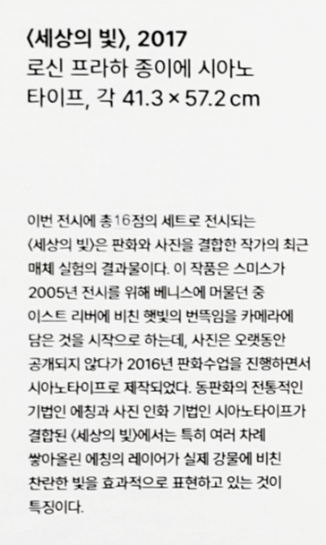 이번 전시에 총 14점의 세트로 전시되는 <세상의 빛>은 판화와 사진을 결합한 키키 스미스의 최근 매체 실험의 결과물입니다. 이 작품은 작가가 2005년 전시를 위해 베니스에 머물던 중 이스트 리버에 비친 햇빛의 번뜩임을 카메라에 담은 것을 시작으로 합니다. 사진은 오랫동안 공개되지 않다가 2016년 작가가 판화수업을 진행하면서 시아노타이프로 제작되었습니다. 동판화의 전통적인 기법인 에칭과 사진 인화 기법인 시아노타이프가 결합된 이 작품에서는 특히 여러 차례 쌓아올린 에칭의 레이어가 실제 강물에 비친 찬란한 빛을 효과적으로 표현하고 있는 것이 특징입니다.
