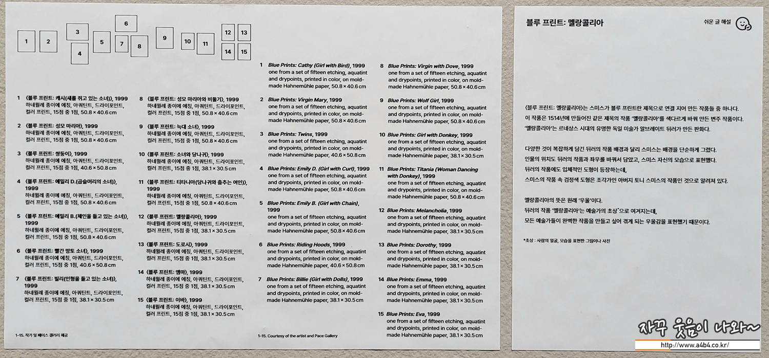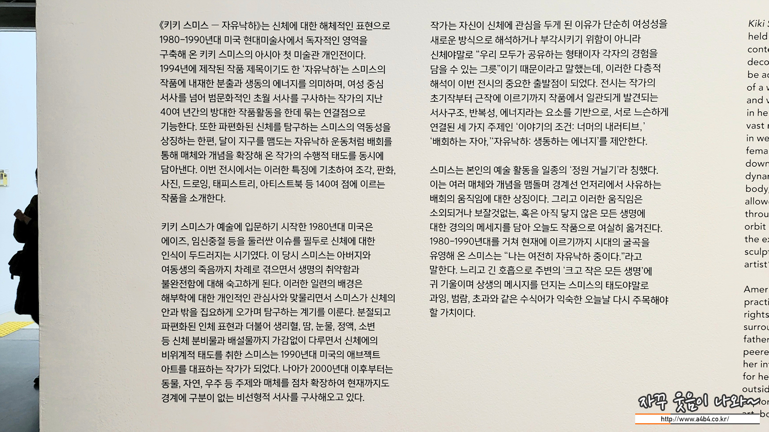 이번 전시회는 2023년 3월 12일 까지 서울 시립미술관 서소문본관 1층과 2층에서 전시합니다. 관람료는 무료이며 조각, 판화, 사진, 태피스트리, 아티스트북 등 키키스미스 작품 140여 점이 전시되고 있습니다.