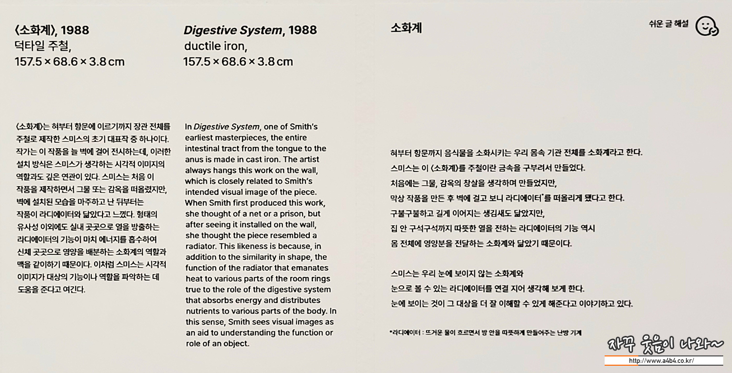 <소화계>는 혀부터 항문에 이르기까지 장관 전체를 주철로 제작한 스미스의 초기 대표작 중 하나입니다. 작가는 이 작품을 늘 벽에 걸어 전시하는데, 이러한 설치 방식은 스미스가 생각하는 시각적 이미지의 역할과도 깊은 연관이 있습니다. 스미스는 처음 이 작품을 제작하면서 그물 또는 감옥을 떠올렸지만, 벽에 설치된 모습을 마주하고 난 뒤부터는 작품이 라디에이터와 닮았다고 느꼈습니다. 형태의 유사성 이외에도 실내 곳곳으로 열을 방출하는 라디에이터의 기능이 마치 에너지를 흡수하여 신체 곳곳으로 영양을 배분하는 소화계의 역할과 맥을 같이하기 때문입니다. 이처럼 스미스는 시각적 이미지가 대상의 기능이나 역할을 파악하는 데 도움을 준다고 여깁니다.