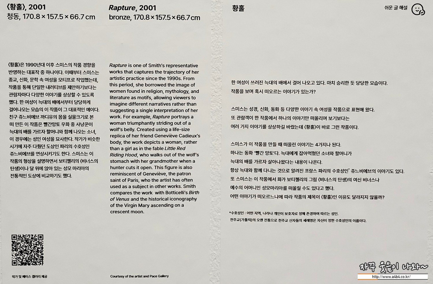 <황홀>은 1990년대 이후 스미스의 작품 경향을 반영하는 대표작 중 하나입니다. 이때부터 스미스는 종교, 신화, 문학 속 여성을 모티프로 작업했는데, 작품을 통해 단일한 내러티브를 제안하기 보다는 관람자마다 다양한 이야기를 상상할 수 있도록 했습니다. 한 여성이 늑대의 배에서부터 당당하게 걸어나오는 모습의 이 작품이 그 대표적인 예입이다. 친구 쥬느비에브 까디유의 몸을 실물크기로 본 떠 만든 이 작품은 빨간 망토 우화 중 사냥꾼이 늑대의 배를 가르자 할머니와 함께 나오는 소녀, 이 경우에는 성인 여성을 묘사합니다. 작가가 비슷한 시기에 자주 다뤘던 도상인 파리의 수호성인 쥬느비에브를 연상시키기도 합니다. 스미스는 이 작품의 형상을 설명하면서 보티첼리의 <비너스의 탄생>이나 달 위에 앉아 있는 성모 마리아의 전통적인 도상에 비교하기도 했습니다.