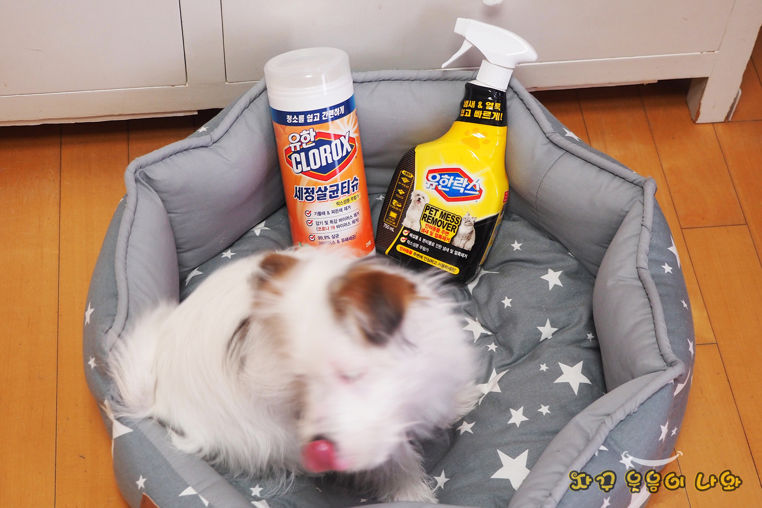 동봉된 제품은 유한 세정살균티슈와 유한약품 '펫 메스 리무버 (Pet Mess Remover)' 두 종 입니다.