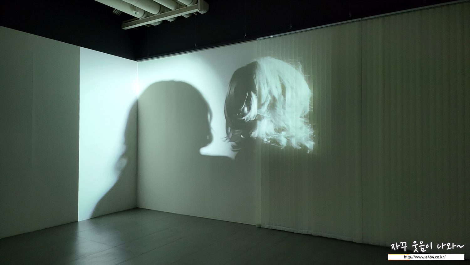 전시의 마지막 작품인 <라이트 테스트 Light Test>는 전설로 남은 여성들의 얼굴에 머리카락을 콜라주해 만든 전시의 첫 번째 작품 <헤어 포트레이트>를 떠올리게 합니다. 전통적으로 초상화는 주로 모델을 보고 그렸지만, 이 작품에서 마르지엘라는 <헤어 포트레이트>의 잡지 표지에 등장시킨 환상의 생명체에 생기를 불어넣어 가상의 인물을 만들어냅니다. 이 인물은 모든 행동이 드라마틱 하게 보여집니다. 그녀를 둘러싼 회화에 주로 보이는 음영법인 키아로스쿠로(chiaroscuro) 속의 그림자가 천천히 걷는 그녀를 따라갑니다. 이 흑백 영화에 때아닌 컬러 화면의 중간 광고가 불쑥 끼어들어 전시 포스터이자 대표 이미지인 데오도란트를 홍보합니다. 이 중간 광고는 관람객과 영화의 주인공을 연결하는 리듬과 친밀감을 방해합니다. 이윽고 카메라를 향해 몸을 돌리고 웃음을 터트리는 모습을 통해, 그녀가 특이한 인물이라는 것을 알아차릴 수 있습니다.
