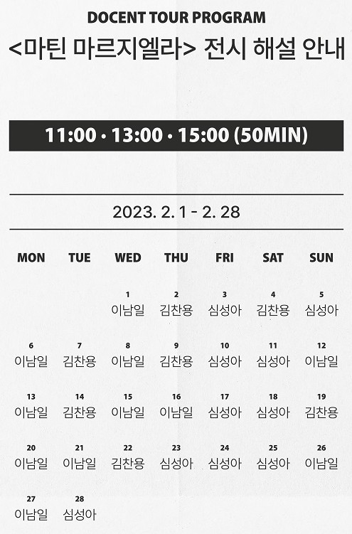 마틴 마르지엘라 전시회는 평일과 주말 11시 13시15시 총 3회 도슨트가 진행됩니다. 최근 주말 도슨트를 운영하는 전시회는 거의 찾아보기 어려운데요. 너무나도 반가운 소식이었습니다.
