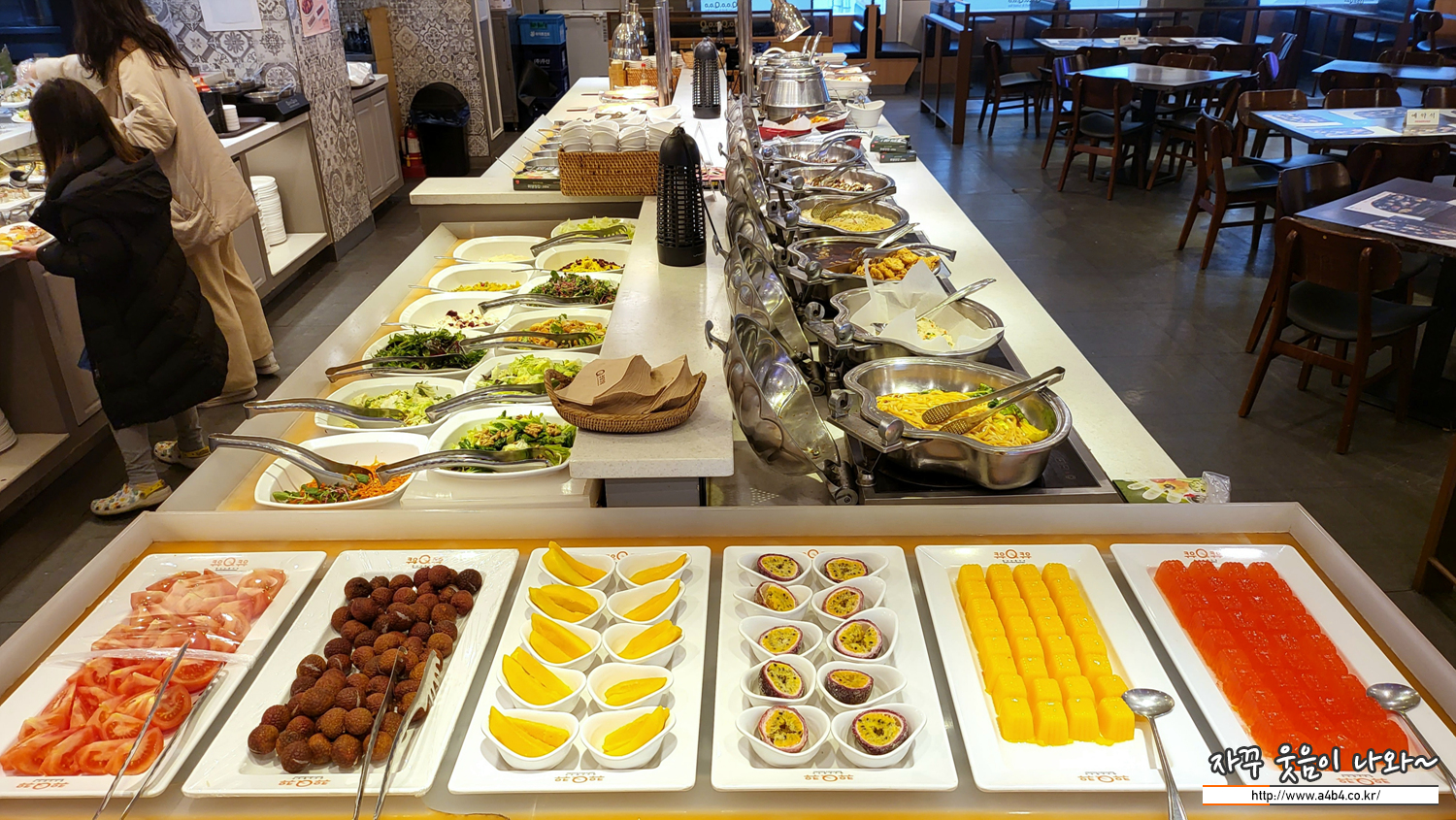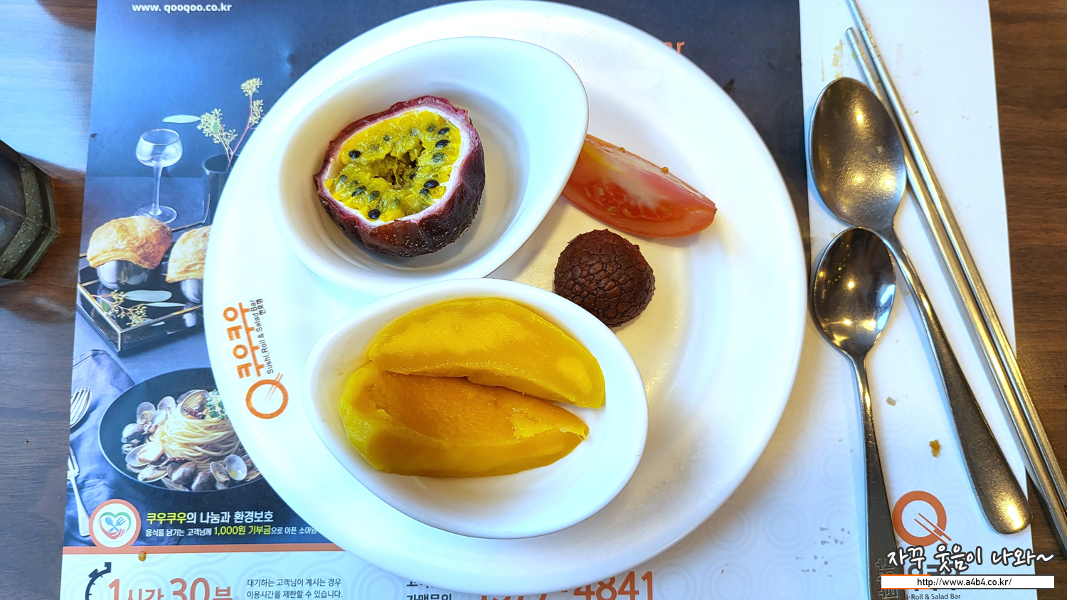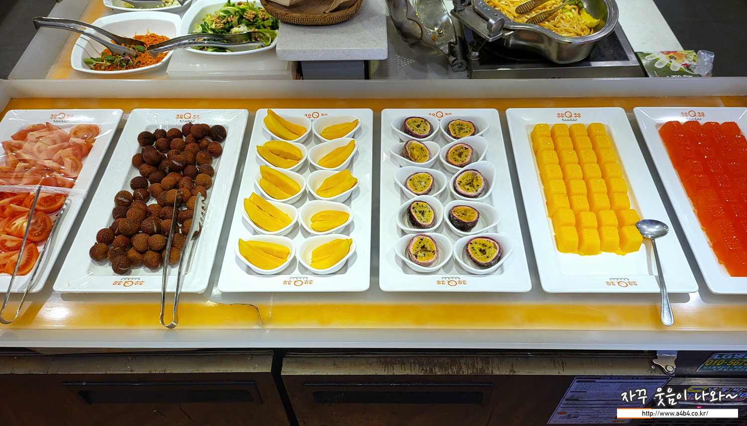 쿠우쿠우 과일은 망고, 토마토, 람부탄 리치, 패션프루트가 있네요.