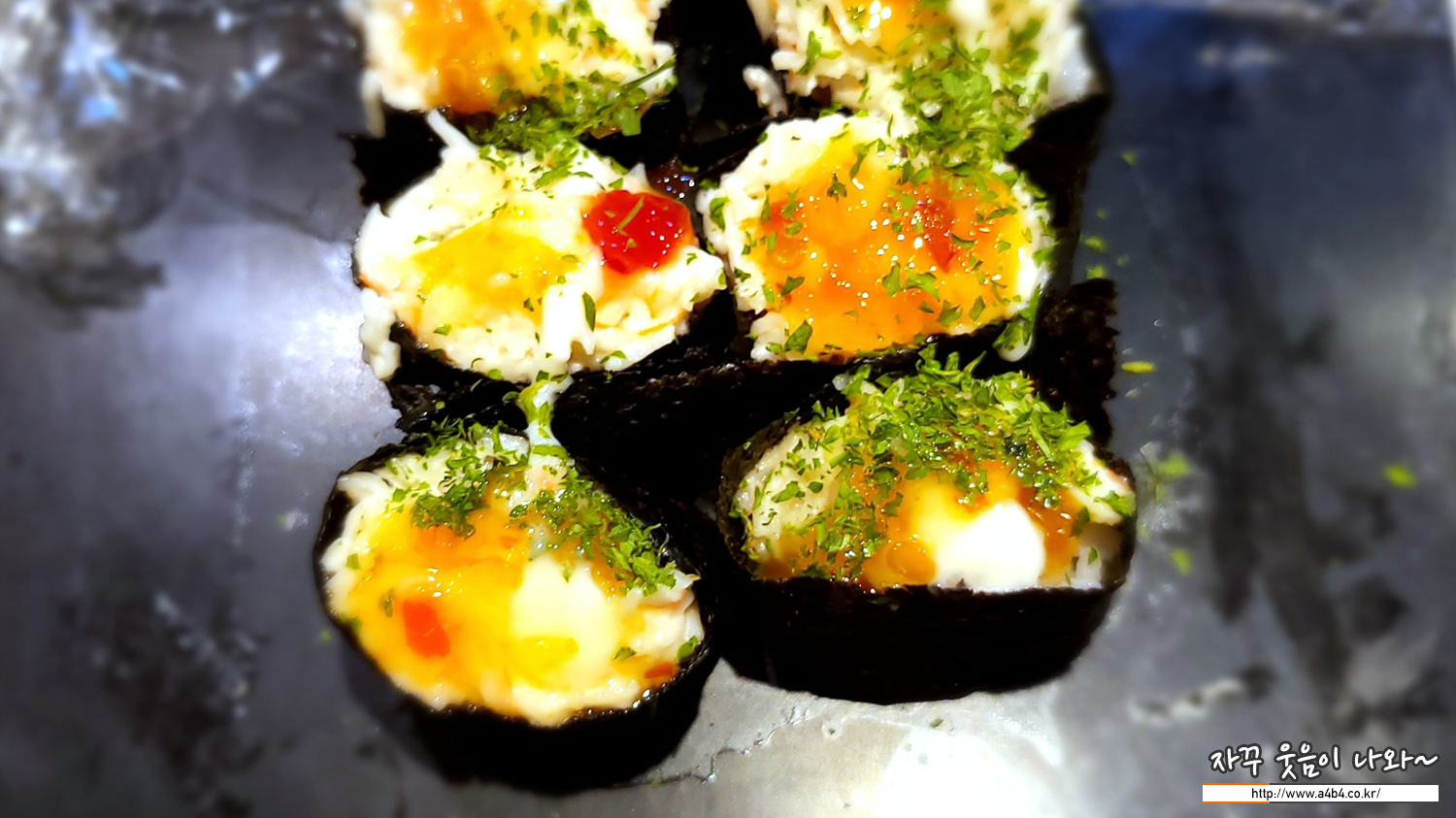 종류는 BBQ롤, 후리가케롤, 게살샐러드롤, 장어롤, 크런치롤, 캘리포니아롤, 훈제연어롤, 새우롤, 치즈롤, 소고기롤, 참치롤, 연어롤, 치킨롤, 타코와사비군함, 날치알군함, 볶음김치군함 등이 있습니다.